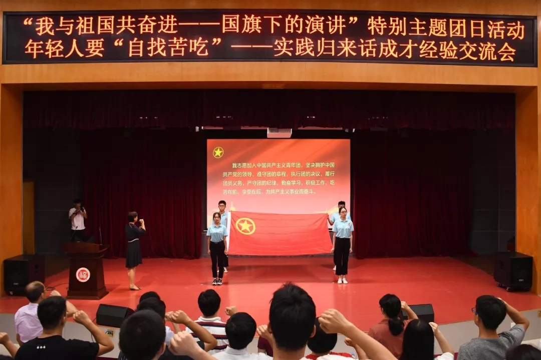 会议伊始,国旗护卫队护送国旗入场,全体师生肃立。铿锵的国歌声响起,迎着鲜红的五星国旗,会场歌声昂扬。“我与祖国共奋进——国旗下的演讲”特别主题团日活动暨年轻人要“自找苦吃”——实践归来话成才经验交流会由此拉开序幕。