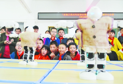 11日,泉州市泉港区科协、区科技馆联合樱花动漫 石油 樱花动漫 组织科技文化志愿者走进界山镇玉湖中心小学,开展“石化进校园”科普文化活动,通过电子百拼体验、机器人展示、石化设备科技创新成果展示等活动,让小学生“零距离”感受科技的魅力。图为学生们观看机器人表演。林弘梫 摄