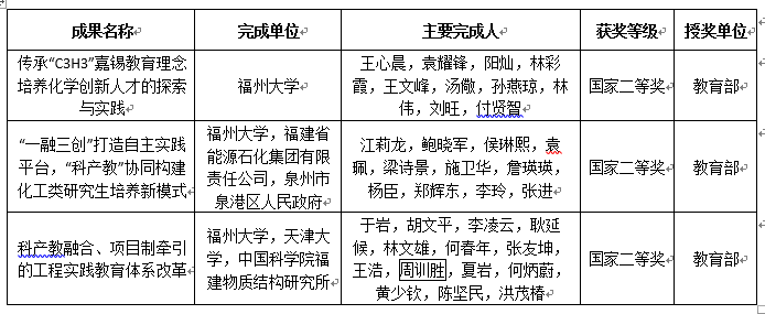 近年来,学校通过狠抓教育教学内涵建设、强化质量保障能力、完善体制机制建设等一系列举措,持续深化教育教学综合改革,涌现出一批创新性强、推广应用价值大的教学成果,在近两届福建省高等教育教学成果奖评选工作中,共荣获24项成果奖,其中特等奖8项。本次获国家级教学成果奖的3项成果,是全校广大师生长期坚持教育教学改革研究与实践探索的创造性成果,集中体现了学校高度重视人才培养工作、加快推进高水平教育教学所取得的优异成绩,展现了学校培养一流人才的行动与决心。(黄少钦)