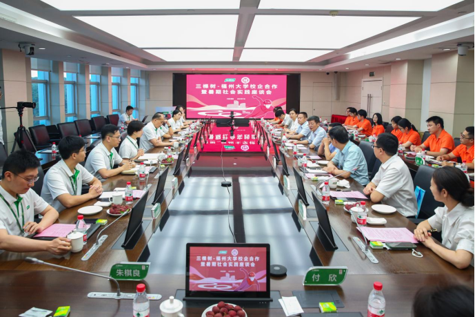 —三棵树校企合作暨暑期社会实践座谈会。会上,三棵树朱奇峰副总裁为与会人员详细介绍了公司情况以及2024届招聘计划,石化学院团委书记伍宇翔、博士生实践队队长赵丹先后向付贤智校长汇报了石化学院2023年暑期社会实践总体情况和博士生实践队社会实践进展,校企双方还就产学研合作等方面进行了深入交流。