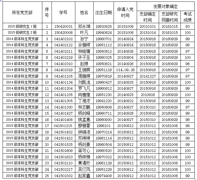 按照发展党员工作有关规定,经各党支部研究,学院党委于 2016 年 10 月15 日备案同意郑永坤等25名同志为发展对象,经政治审查合格,现将2016年下半年发展对象有关情况公示如下: