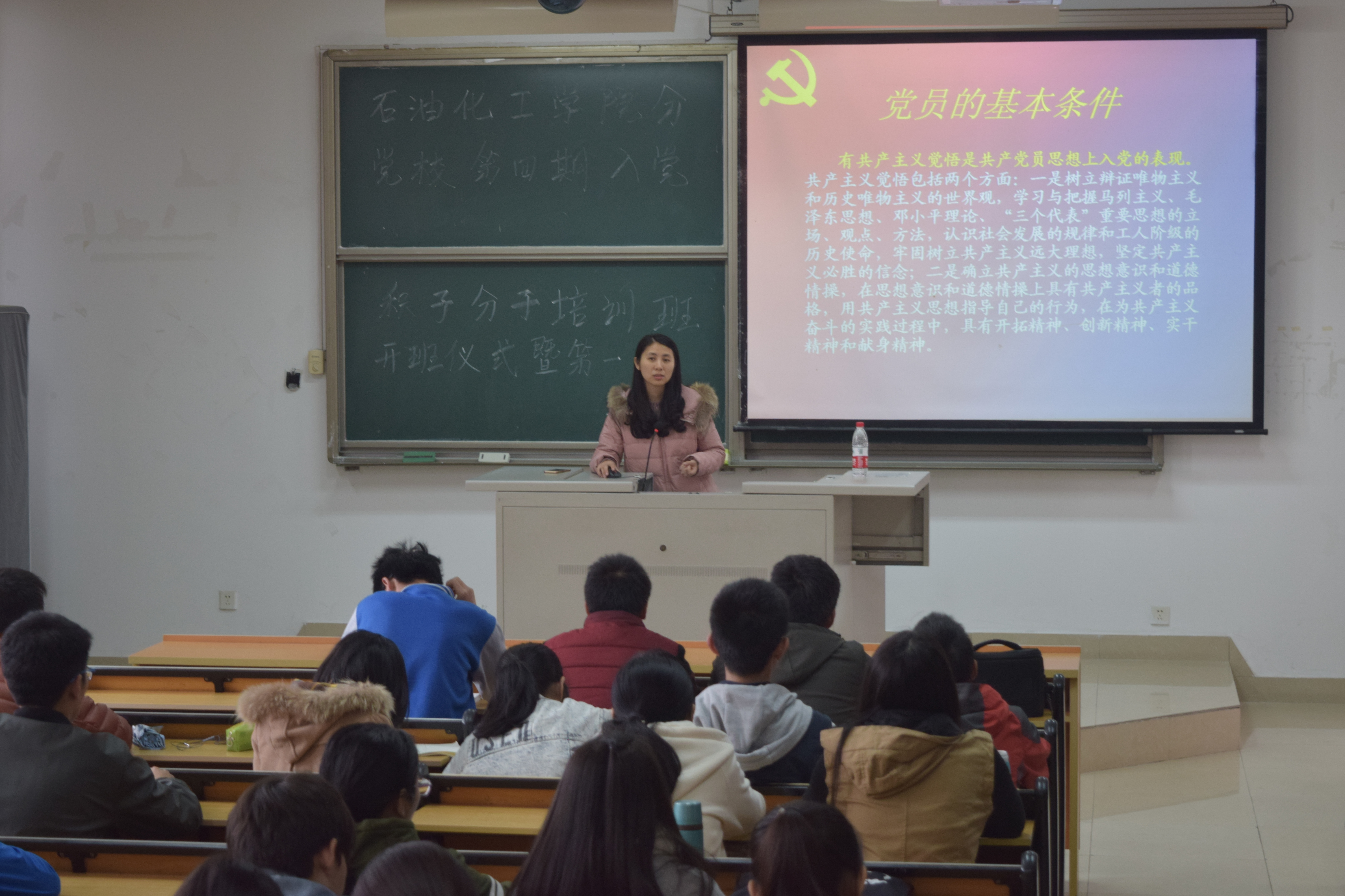2017年3月19日下午两点半,石化学院分党校第四期入党积极分子培训班开班仪式暨第一讲在文一204顺利举行,本次培训会由团委书记蒋林娟老师主讲。首先蒋老师就本次入党积极分子培训对于积极分子提出殷切希望,旨在提高积极分子对党组织的认识,端正入党动机,建立共产主义觉悟,为保持基层党组织生机和活力奠定基础。 接着蒋林娟老师以“新时期学生党员发展标准”为主题开展讲座。