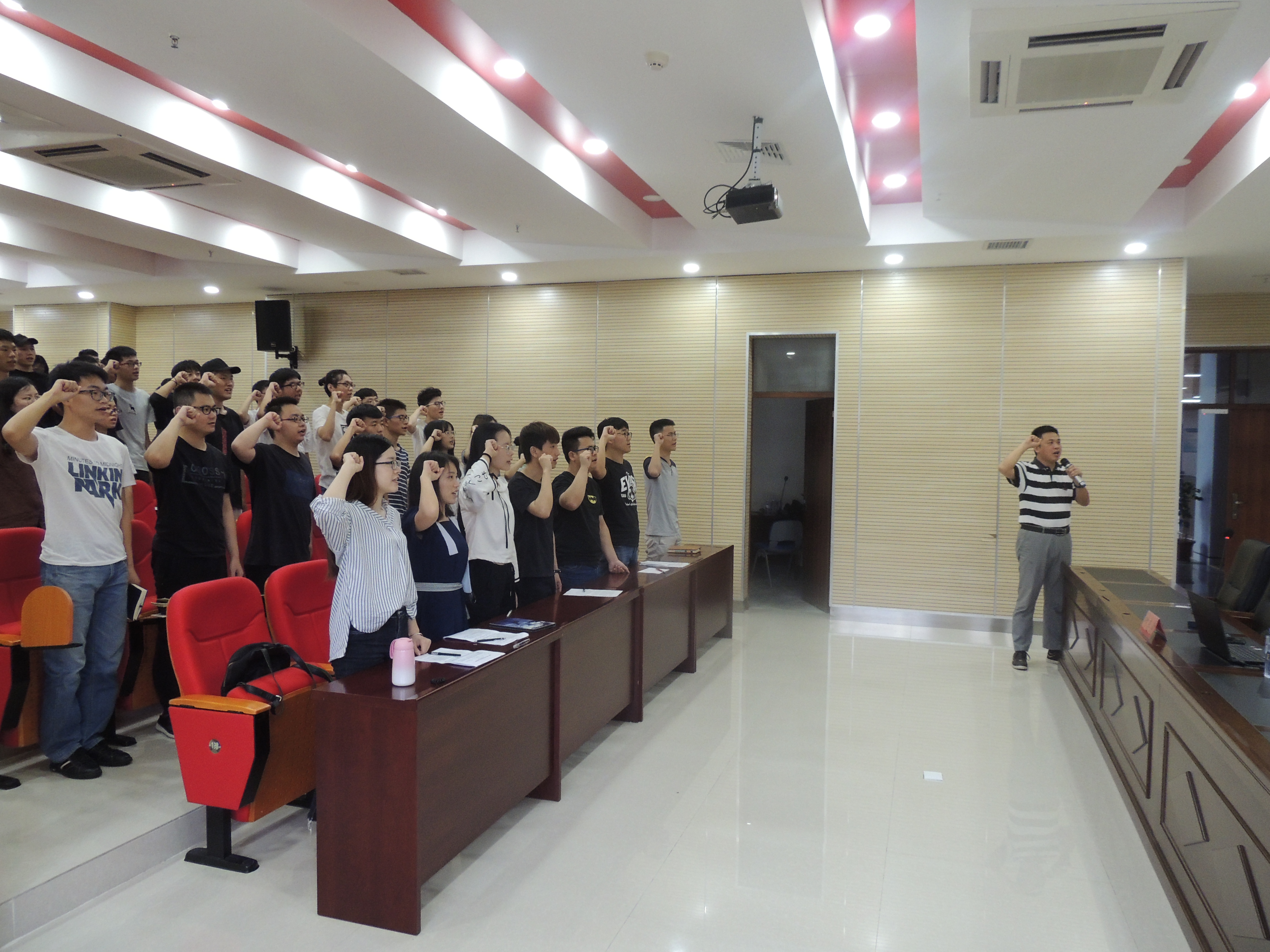 化工学科取得的重大的突破和学院的发展概况,也勉励大家要时刻坚守初心,以一名化工人的初心对待即将面对的学习、工作和生活。要时刻警醒自己,作为中国社会主义建设的中坚力量,大家要坚定信念,对党忠诚;要立德修身,锤炼党性;要遵纪守规,守牢底线,切实体现福大化工人的精神。同时给予毕业班党员们一些期望,希望大家要担当尽责,创先争优;要重视合作,融入团队;要主动想事,积极做事;要感恩他人,心中有爱。同时叶书记也用“十心五情”的为人准则来与大家共勉,激励大家要走好人生的每一步。最后,在叶志清书记的带领下,全体毕业生党员共同重温入党誓词。在富有仪式感的声声宣誓声中,让全体毕业班党员更加深刻牢记自己入党的初心。