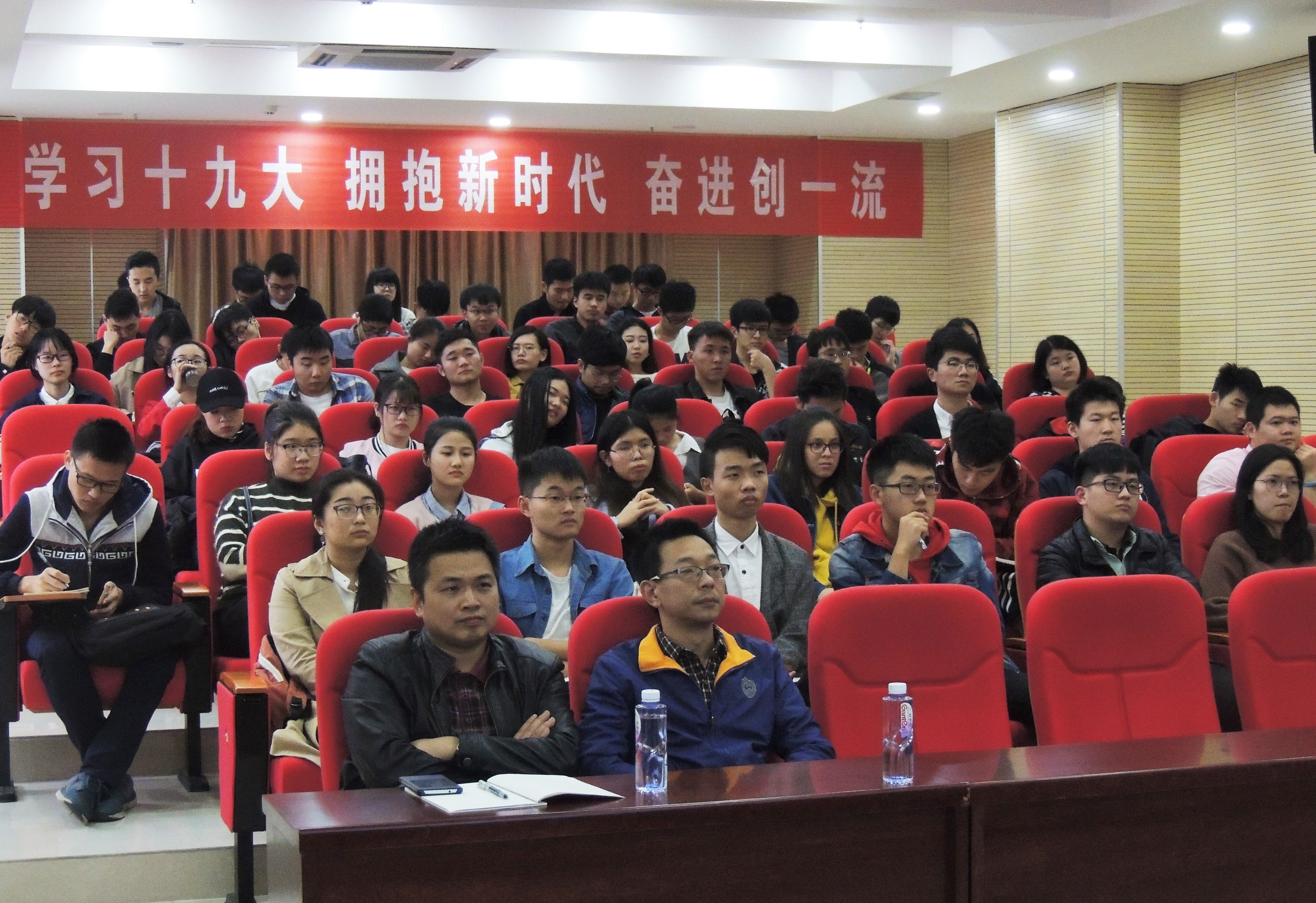 党的十九大精神宣讲团成员、法学院副院长丁国民教授作为主讲嘉宾。本场讲座由学院党委书记叶志清老师主持,学院师生党员参加。泉港区前黄镇党委副书记林晓波同志也带队参加本次学习。