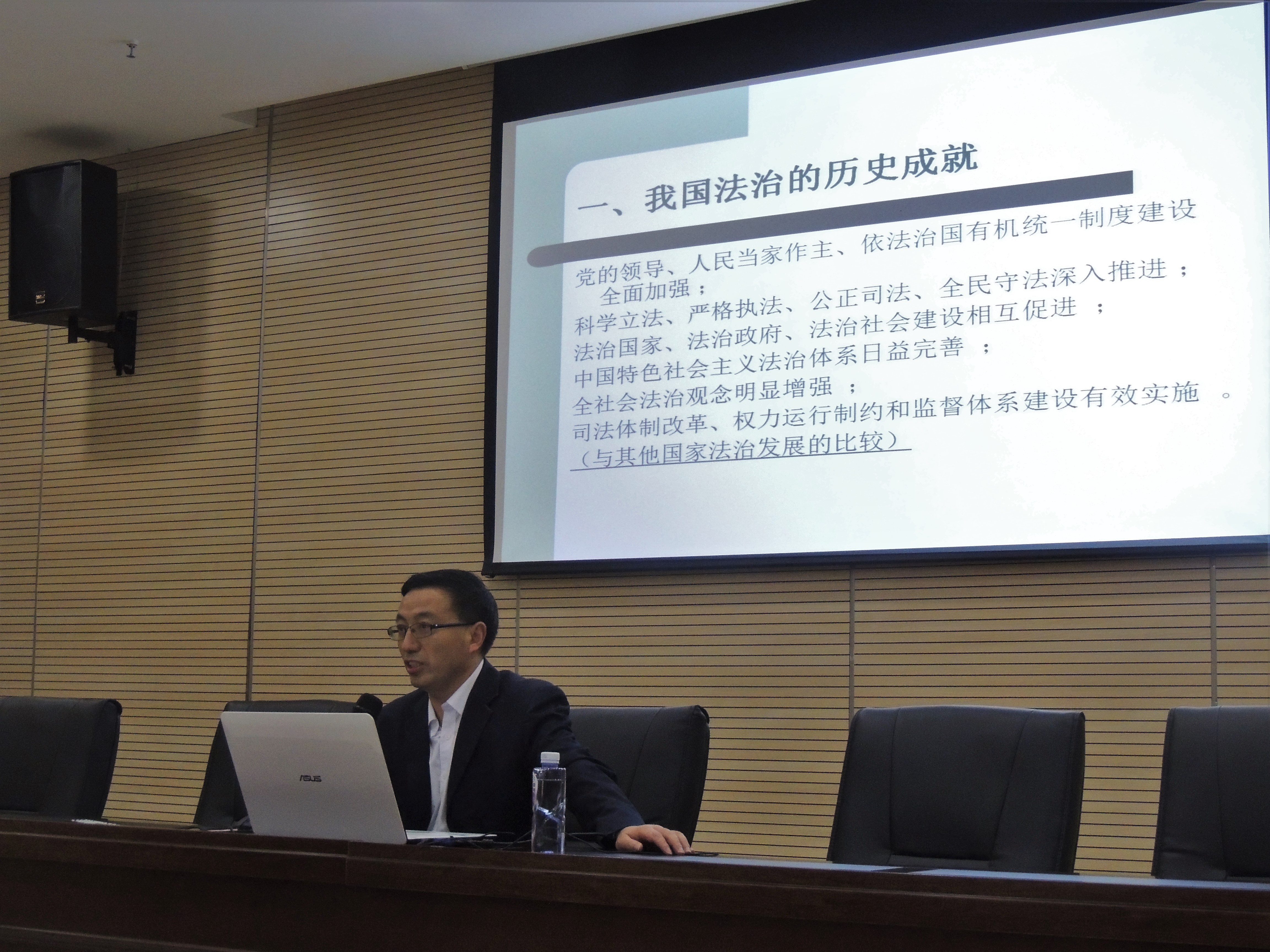 丁国民教授主要从依法治国的角度与同志们分享了自己对十九大的学习心得,内容分为五个方面:我国法治的历史成就、国家治理体系和治理能力有待加强、我国法治的新目标、全面依法治国新方略、深化依法治国新举措,为同志们上了一堂生动的法治普及课。