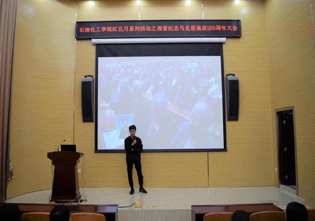大会上,习近平总书记针对马克思和中国、马克思主义和中国的关系发表了看法和见解,阐述了马克思主义对中国社会发展的重要性。此次观看现场庄严隆重,同学们秩序井然、神情专注,时而静心记录,时而掌声雷动,认真聆听习近平总书记在大会上的重要讲话,深刻学习领会习近平总书记重要讲话精神。观看过后大家学习讨论了马克思主义和中国的密切关系,充分认识到马克思主义的理论精髓和在中国革命、建设、改革的实践中取得的巨大成功,学习进一步增强“四个意识”,坚定“四个自信”,为实现中华民族伟大复兴的中国梦贡献力量。随后,团员们都上台分享了自己的观看感受,纷纷表示作为当代大学生要明确新时代继续推进马克思主义中国化的要求,在深入学习马克思主义时应与学习新时代中国特色社会主义思想有机结合,根据时代实践,不断提高认识。