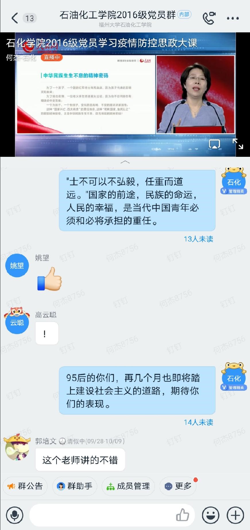 此外,石化学院16级各个学生党支部党员通过在支部群进行直播的形式学习此次疫情防控思政大课,并通过线上进行交流学习心得。