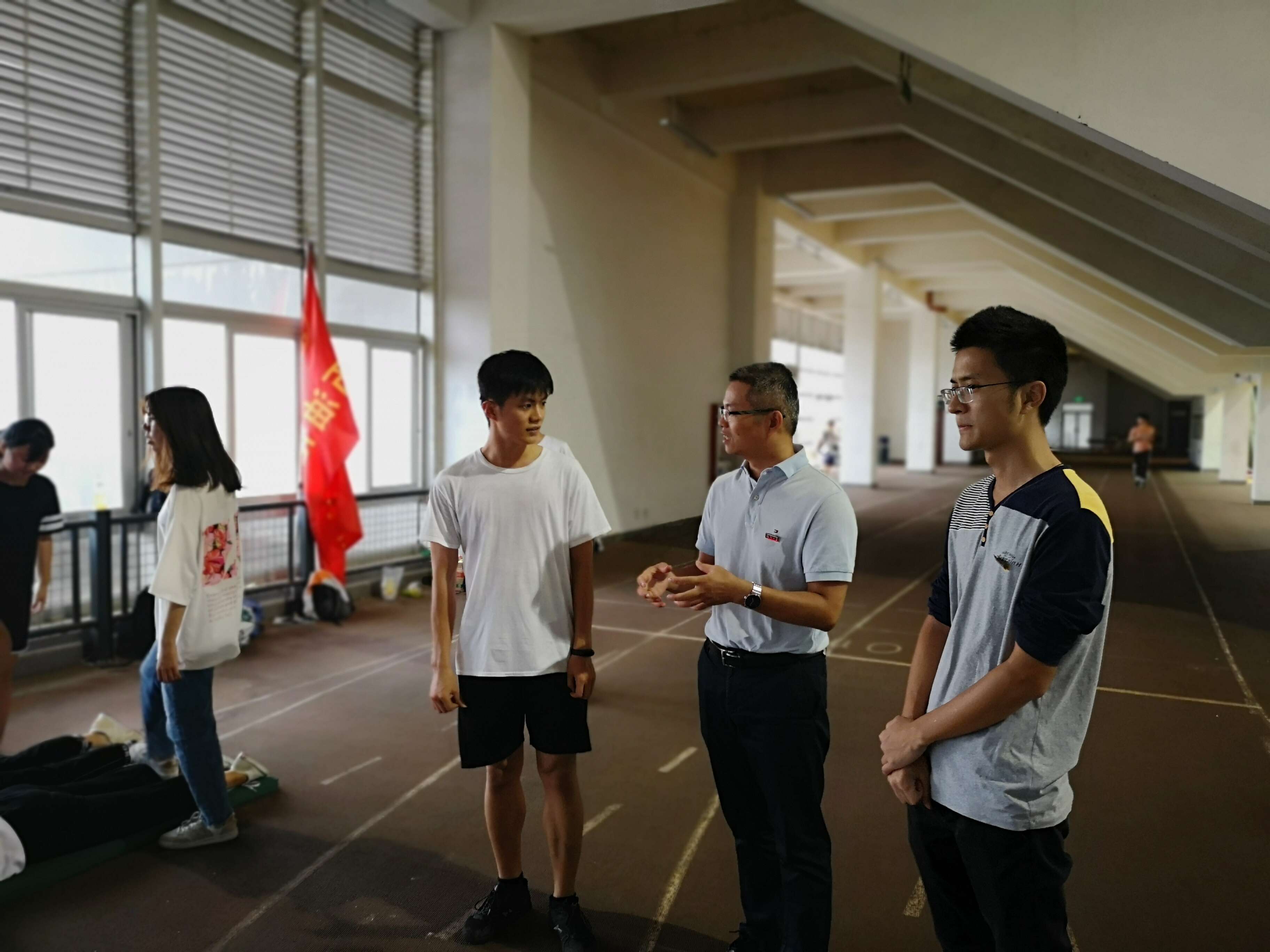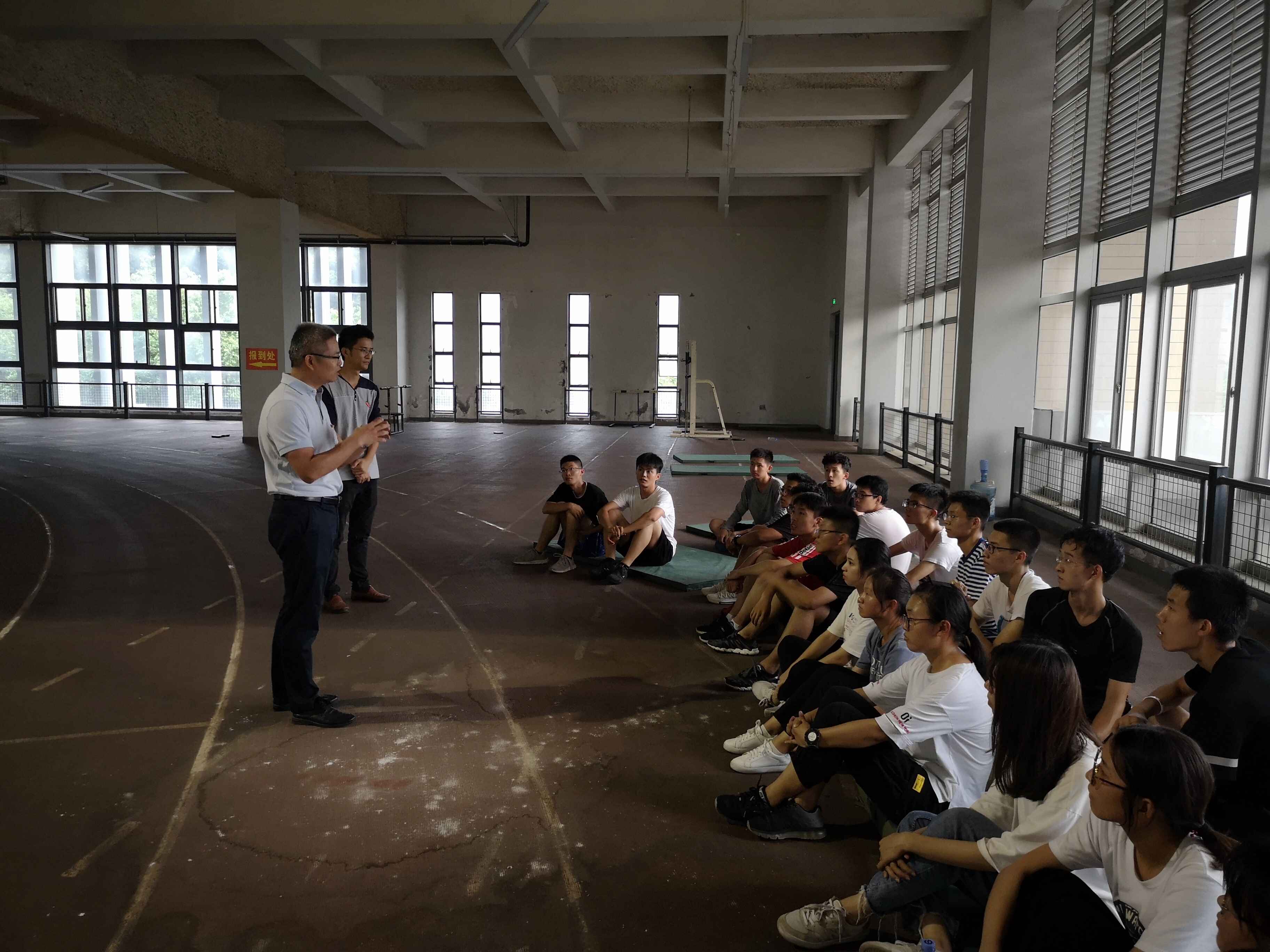 党委副书记岳志强老师、2019级辅导员林泉富老师到三区风雨操场为校运会集训的运动员们做了训练动员。