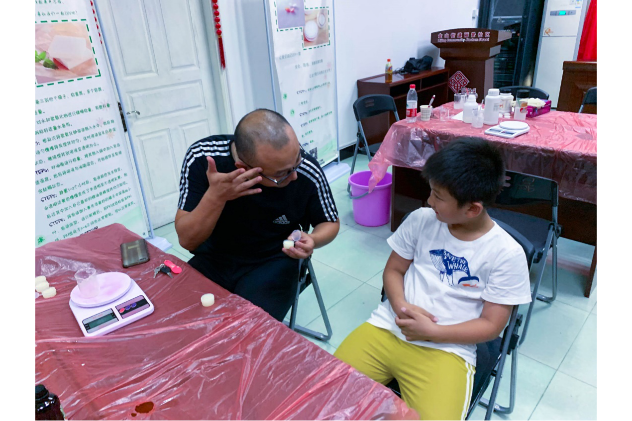 不止手工皂,实践队更制作了日常生活中非常实用的产品:清凉膏。清凉膏的主要原料是蜂蜡、甜杏仁油和薄荷精油,甜杏仁油极为温和,有滋养和保湿的作用,而薄菏精油辛辣而清凉,二者混合使成品清凉膏软而清凉。前来的居民试用了清凉膏,抹在身上冰凉舒爽,一扫夏天的炎热。
