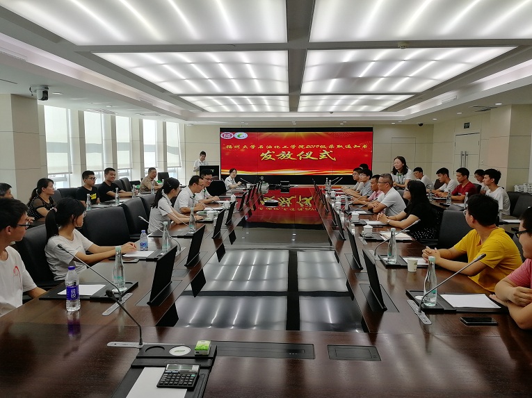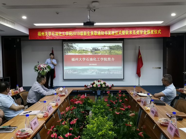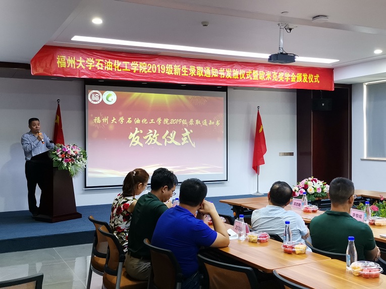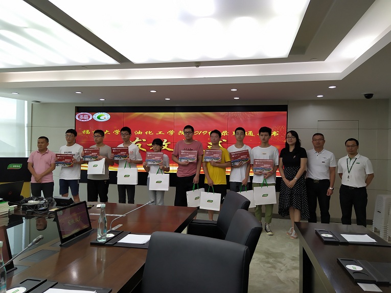 与福建省佑达环保新材料有限公司在泉港区共同举办2019级新生录取通知书发放仪式暨专业教育进企业活动,院党委书记叶志清副教授、党委副书记岳志强副教授、副院长陈全成副教授、福建省佑达环保新材料有限公司总经理刘小勇先生、副总经理刘文生先生、2019级泉州籍新生及家长20余人应邀参加。
