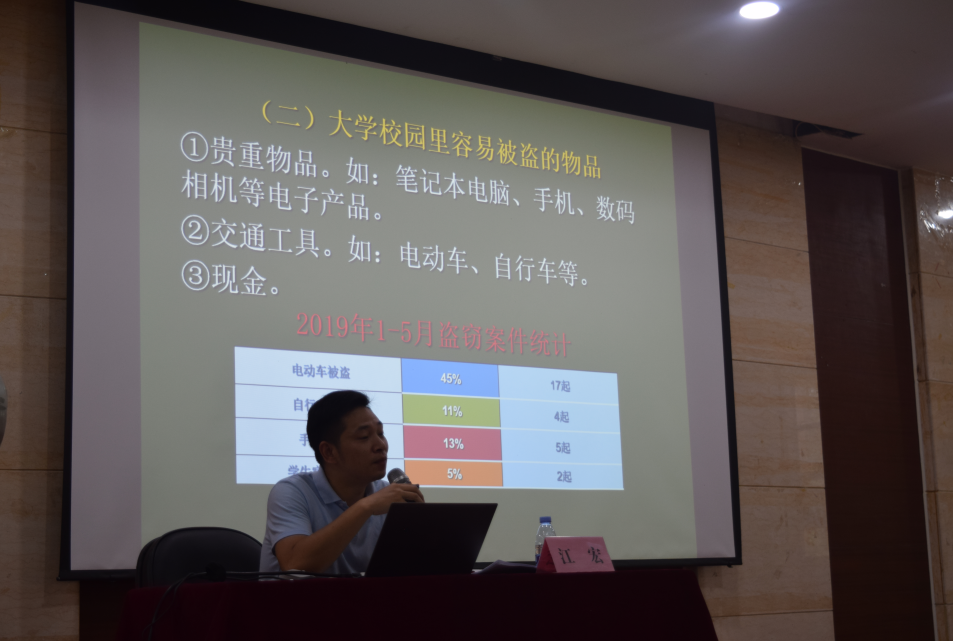 素拓报告厅顺利举行。院邀请校保卫部治安科江宏老师为19级全体新生上了一堂生动的安全教育课。出席本次讲座的有19级新生辅导员林泉富。