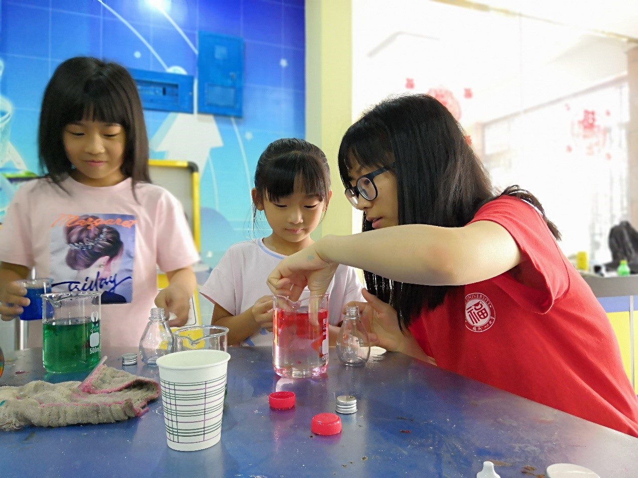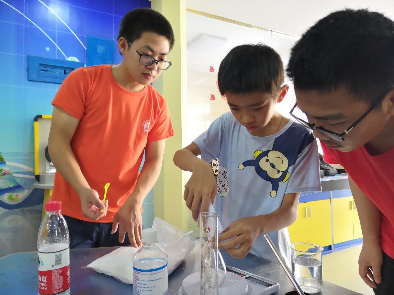 下午,实践队展示了爆爆珠、水晶宝宝两个实验。海藻酸钠溶于冰红茶,滴入乳酸钙中,爆爆珠就成型了,配上冰红茶,一杯饮料就完成了。其中一位小朋友在品尝完后说道:“我要做一杯带回去给我妈妈喝。”这句话使得队员们很是开心;与此同时,五颜六色的水晶宝宝也吸引了不少小朋友的关注。队员们将提前配好的透明溶液混入喜欢的色素,用勺子倒入凝固液中使其成型,五彩缤纷的水晶宝宝也就完成了。有趣、简单好玩的实验是小朋友发现化工魅力的最好的启蒙。与其说是实验,更像是有趣的游戏,在做实验的过程中,寓教于乐,让小朋友们感受化工的生命力和创造力。