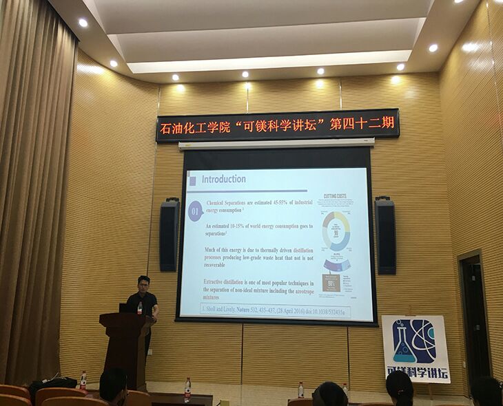 师生带来一次以“萃取精馏过程的计算机辅助绿色溶剂开发与过程强化”的精彩讲座。报告由院杨臣教授主持,吸引了院内许多对该课题有兴趣的老师和研究生到讲座现场。