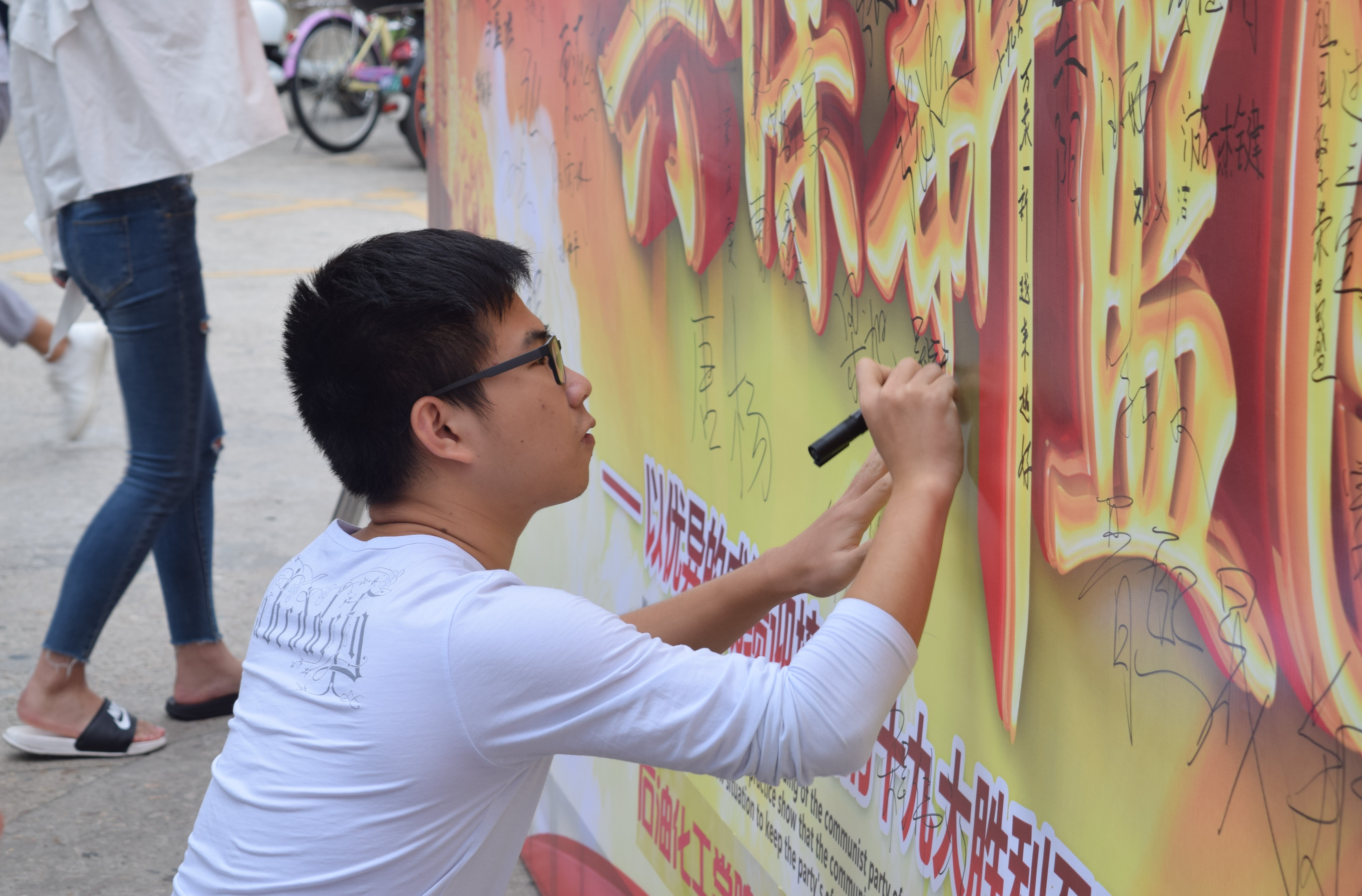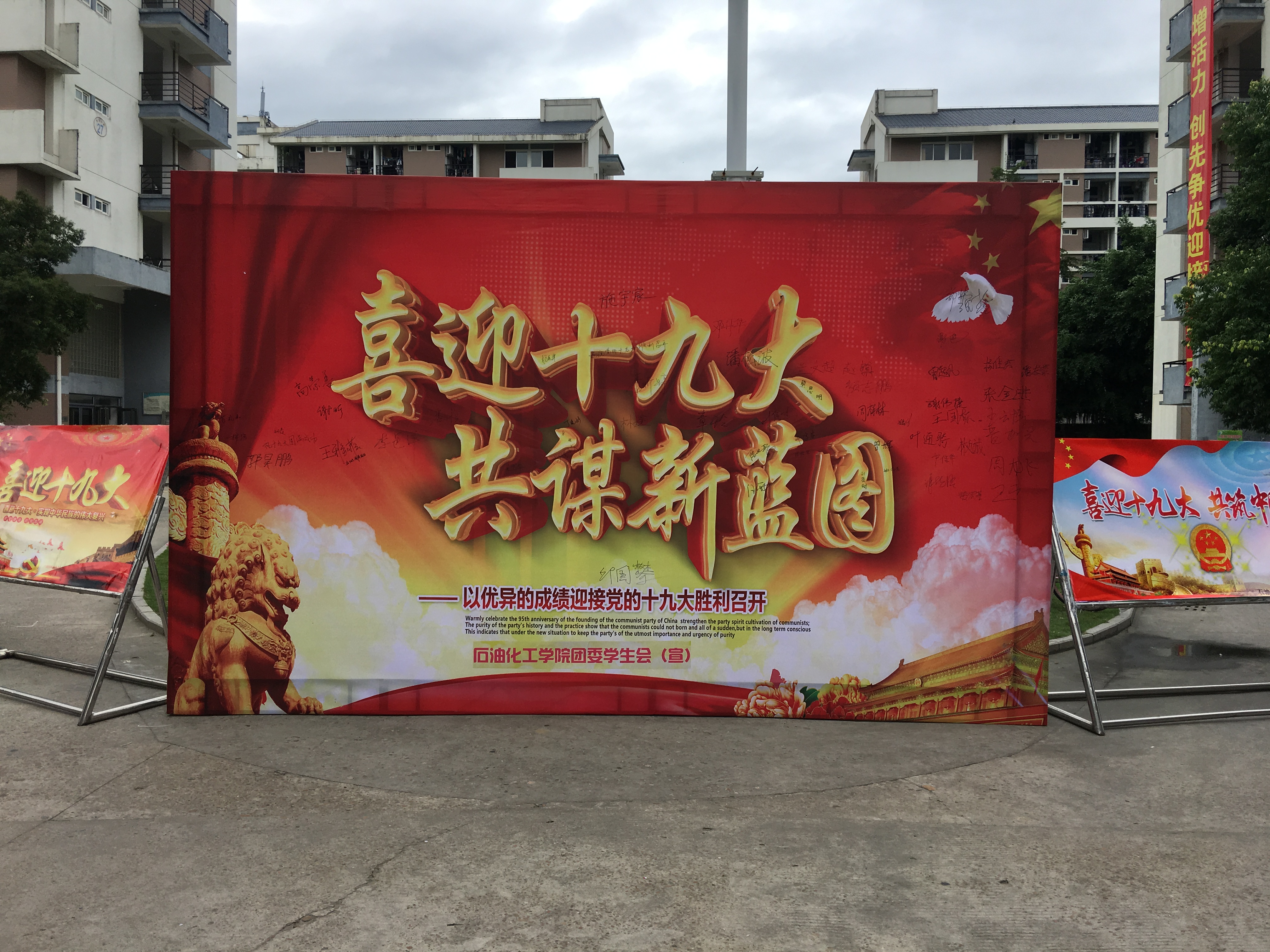 还在博学苑A区设有展览板和太空架,组织各班同学签名留念,让同学们的爱国情怀得以寄托,不少班级更是在展板前合照;同时为抒发广大学生爱党爱国情怀,发起了“喜迎十九大,说句心里话”微祝福征集活动,并第一时间在微博、微信等线上平台进行宣传。