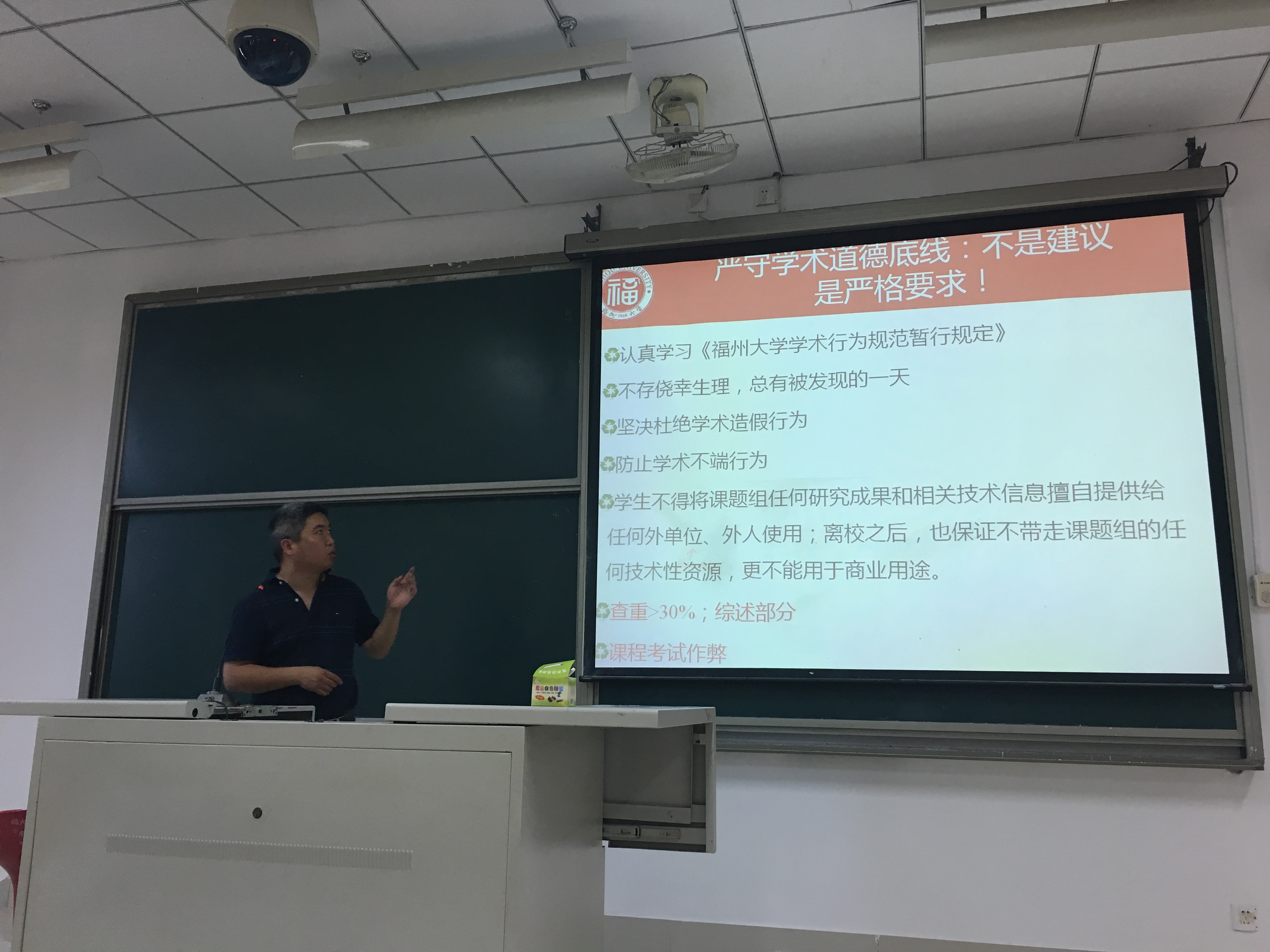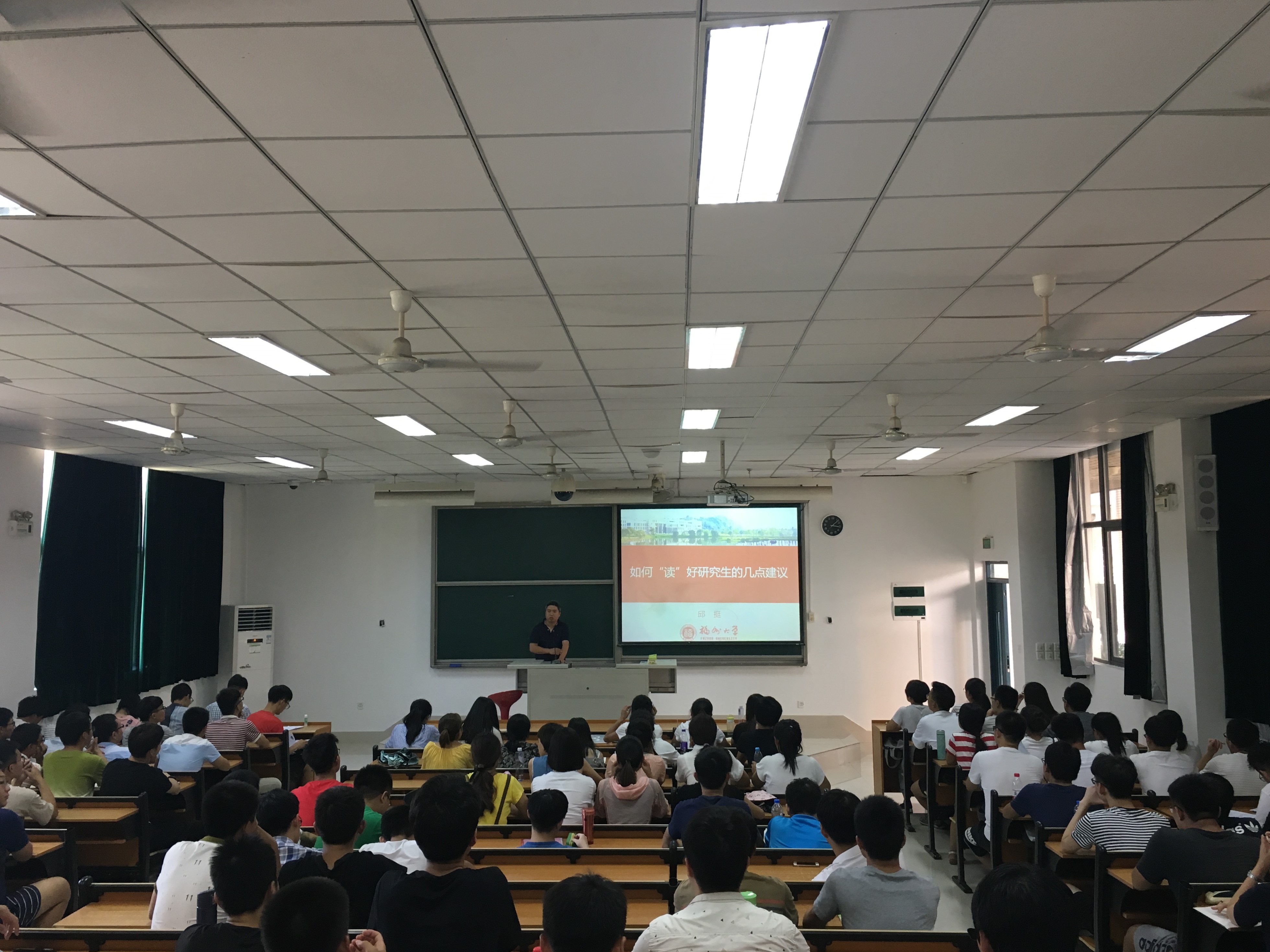 邱挺教授先向大家介绍了研究生期间所应完成的主要课程、论文,以及获取学士学位和毕业证书的相关事项。 邱教授希望大家能够尽快转变角色,研究生相较于本科生有着不同的任务,不同的学习环境,不同的学习方法,告诉大家要作科研的主人,而不是奴隶,合理安排,仔细规划;同时,邱教授还强调作为一名研究生应该要独立思考,要有完全独立研究的思想准备。最后,邱教授告诫大家要严守学术道德底线,做一名严谨又操守的研究生。