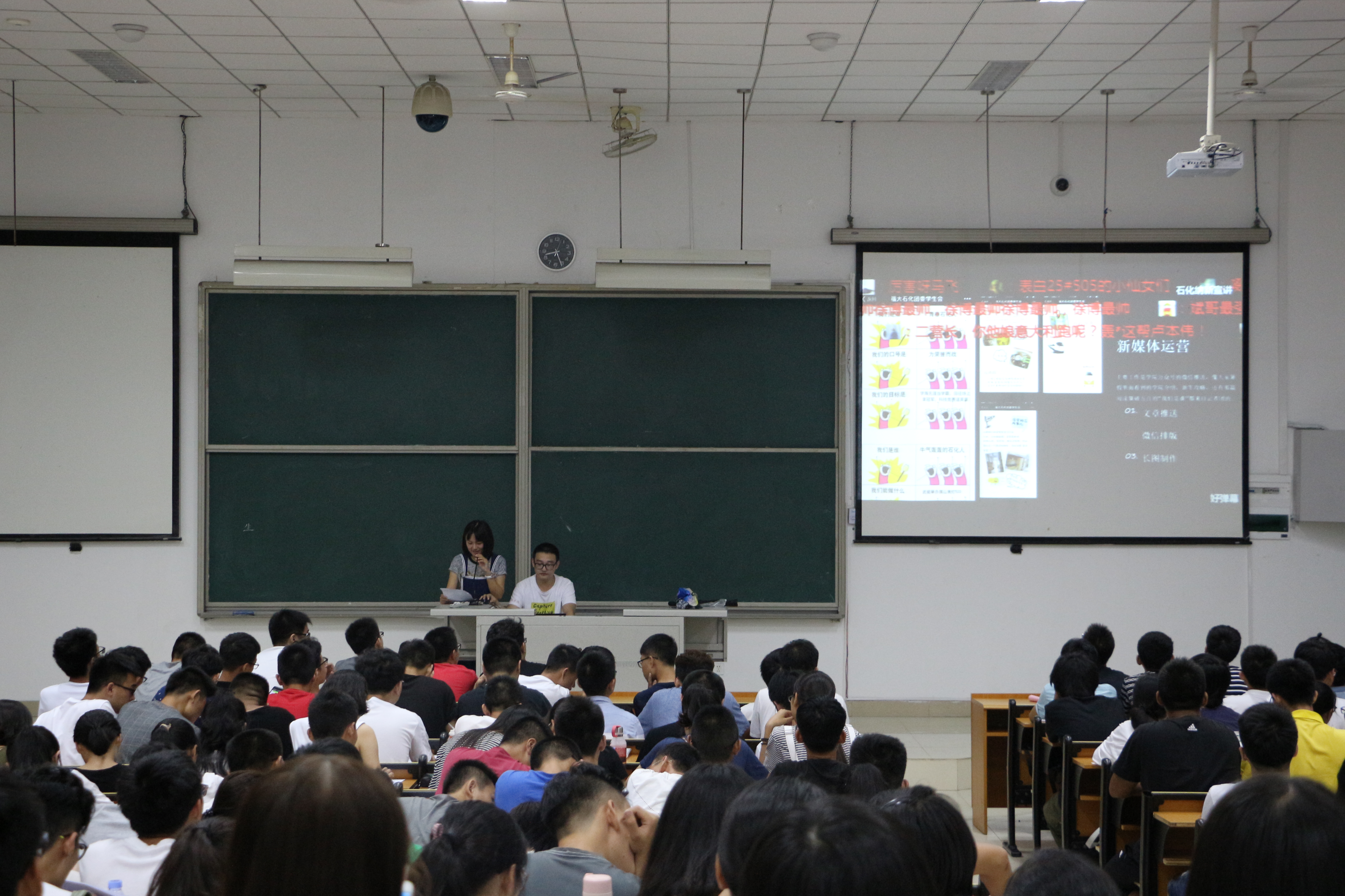 在赵炫凯同学的主持下,各部门在有限的时间内介绍了自己的部门职能和纳新原则,每个部门都用制作精美的PPT,视频等方法结合为大一新生对各部门进行了较为全面的介绍,向新生展示了历年活动的风采,吸引了新生的眼球,希望新生可以根据自己的特长和兴趣爱好选择自己的部门。宣讲会中,现场的新生还可以通过发送弹幕表达自己看法,在中场休息时,新生们更是可以通过摇手机的方法参与抽奖,获得精彩礼品,现场气氛十分热烈。
