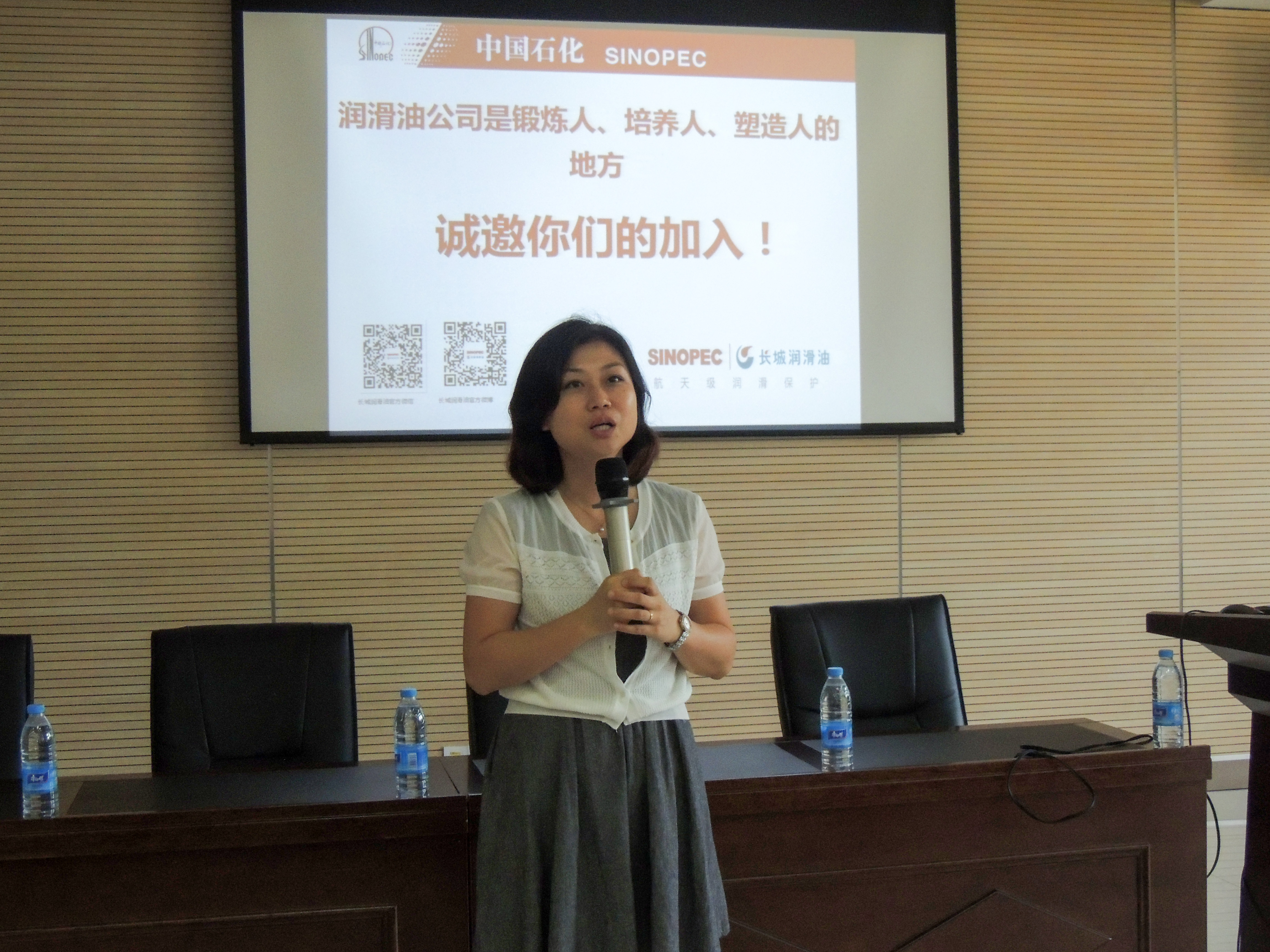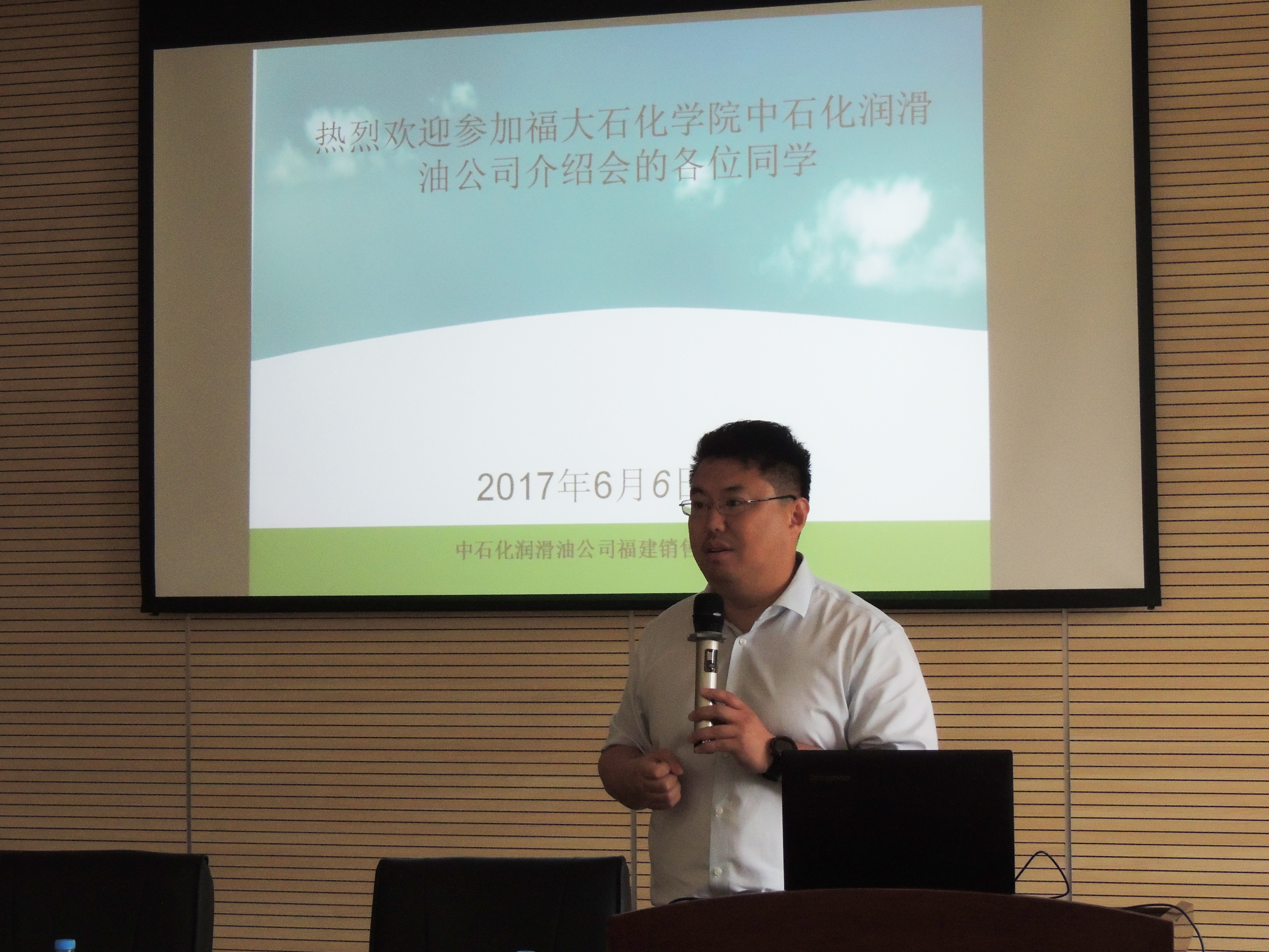 宣讲会伊始,刘寅书记就目前公司的发展前景、行业状况以及本土企业等等做了简介。他真诚地和同学们分享了自己20年的从业心得。他告诉在工作中我们要有快速掌握新知识的能力;在工作中心态要平和,不能毛躁,要踏踏实实地工作;还要具有一定的表达能力。虽然润滑油是传统行业,但不是夕阳行业,我们要用长远的眼光看待它的发展。随后,柯德滋工程师从集团规模、科技含量、樱花动漫等方面介绍了中国石化公司,并对福建润滑油分公司进行了详细的介绍。他还跟我们分享了招聘的条件,传授给了我们一些应聘指南,并与现场的同学们进行了问答互动。