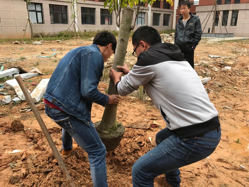 全体志愿者们有序地加入了植树的行列,手持铁锹和水桶,干劲十足,将一颗颗充满生机和希望的小树植入土里。大家看着绿色的树苗代替了原来的荒地,都感觉很有成就感。