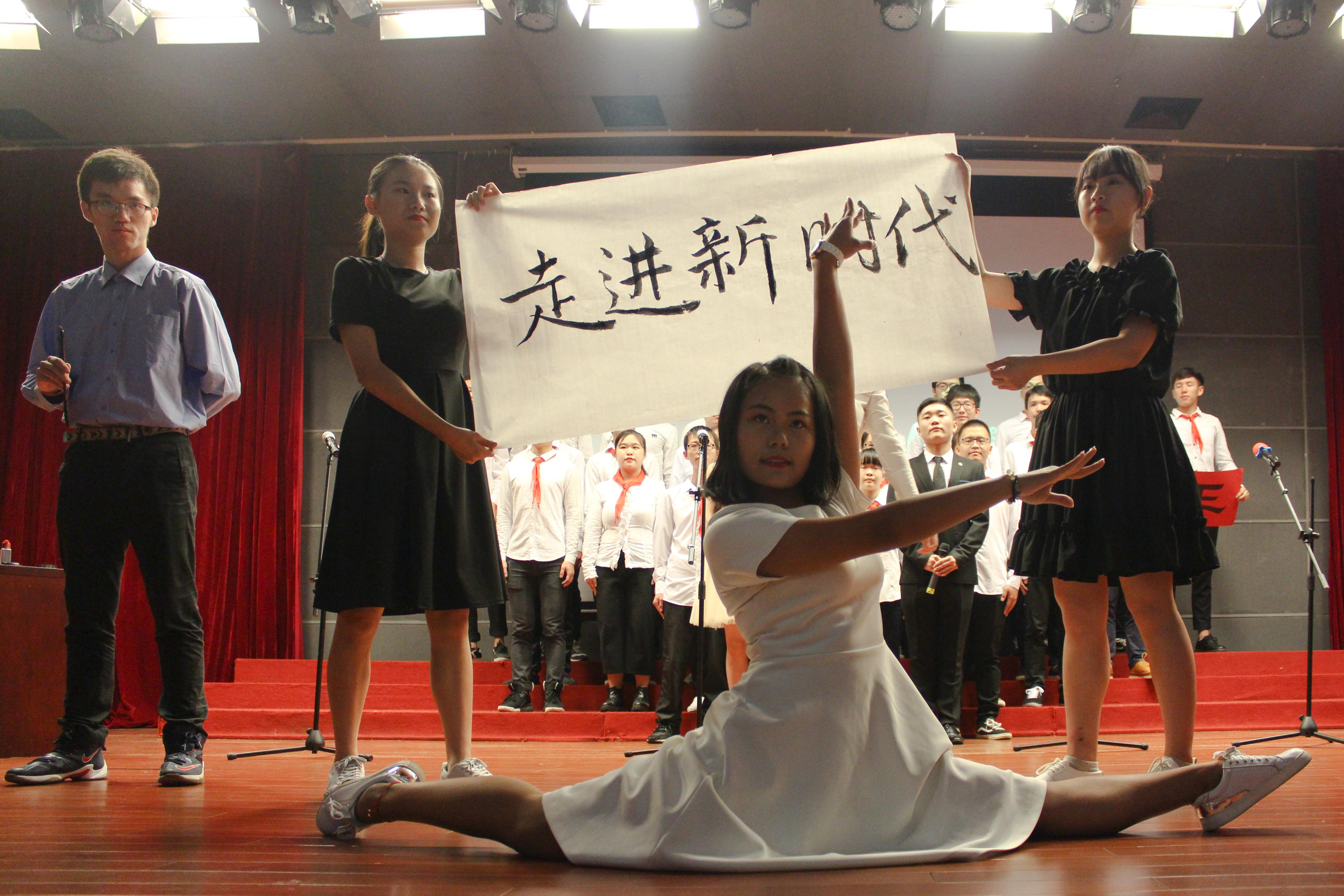 “让我们唱着东方红,当家作主站起来”化工一班整齐嘹亮的歌声、精彩的伴舞和现场提字“走进新时代”的形式赢得了在场评委和观众的认可,赢得了热烈掌声。最终拿下了93.14的高分。