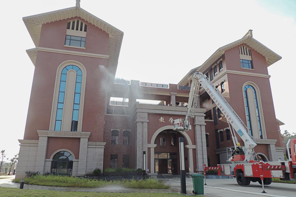 指定时间一到,作为逃生指令的口哨声响起,同学们分别从教学楼、实验楼、宿舍楼、图书馆二层出发,各班同学在班长及工作人员的指挥下有序地从安全通道离开建筑物,并弯腰捂鼻,迅速撤离,安全地在明德广场集合成功。集合后,泉港消防部门专程来为同学们做了消防演练,为同学们演示了喷水管灭火、云梯搭救楼内滞留同学,讲解了基础的消防安全知识,并且现身说法,演示了如何使用灭火器。在活动的最后,消防员亲自教同学们灭火,同学们都参与其中,体验灭火器的使用。