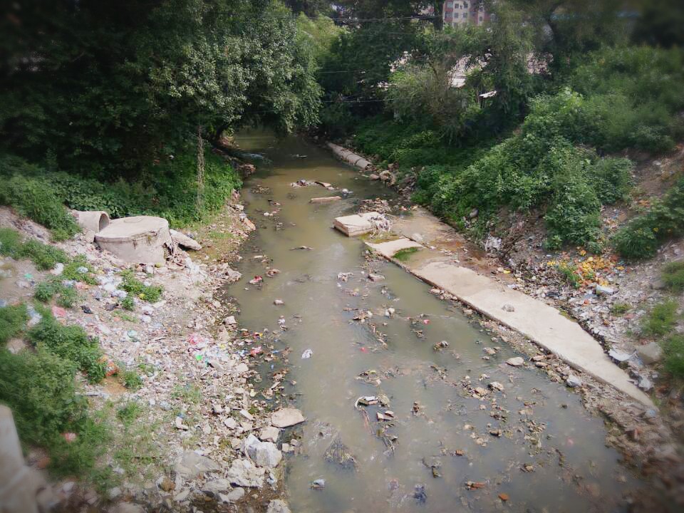 实践队的成员们来到了污水的第一个出口--蜿蜒的河流,通过观察水质澄清度,闻气味,测ph值等简单方法,初步确定污水的一些指标。通过观察测量讨论,成员得知污水基本为中性。