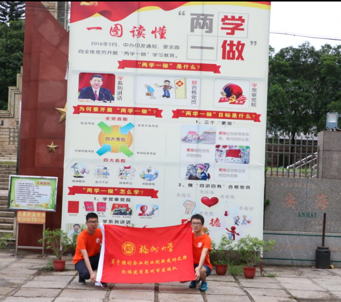探企业创新创业之路,学立行“两学一做”思想。在访谈闲暇,实践队队员瞻仰了安海革命烈士纪念碑,认真学习了各地的两学一做展板的内容。“空谈误国,实干兴邦”,在见证了优秀党员楷模的事迹和党章精神后,实践队队员们更加明白了创新需要实际行动的道理,在今后的道路上,他们将不断激励自己,为祖国创新发展贡献力量。