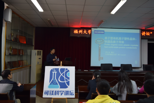 旗山校区嘉锡楼413报告厅顺利召开。本次讲坛由英晓光老师担任主持人,比利时鲁汶大学副研究员罗江水博士担任主讲人,报告题为《质子型有机离子塑性晶体--快固态质子导体》。