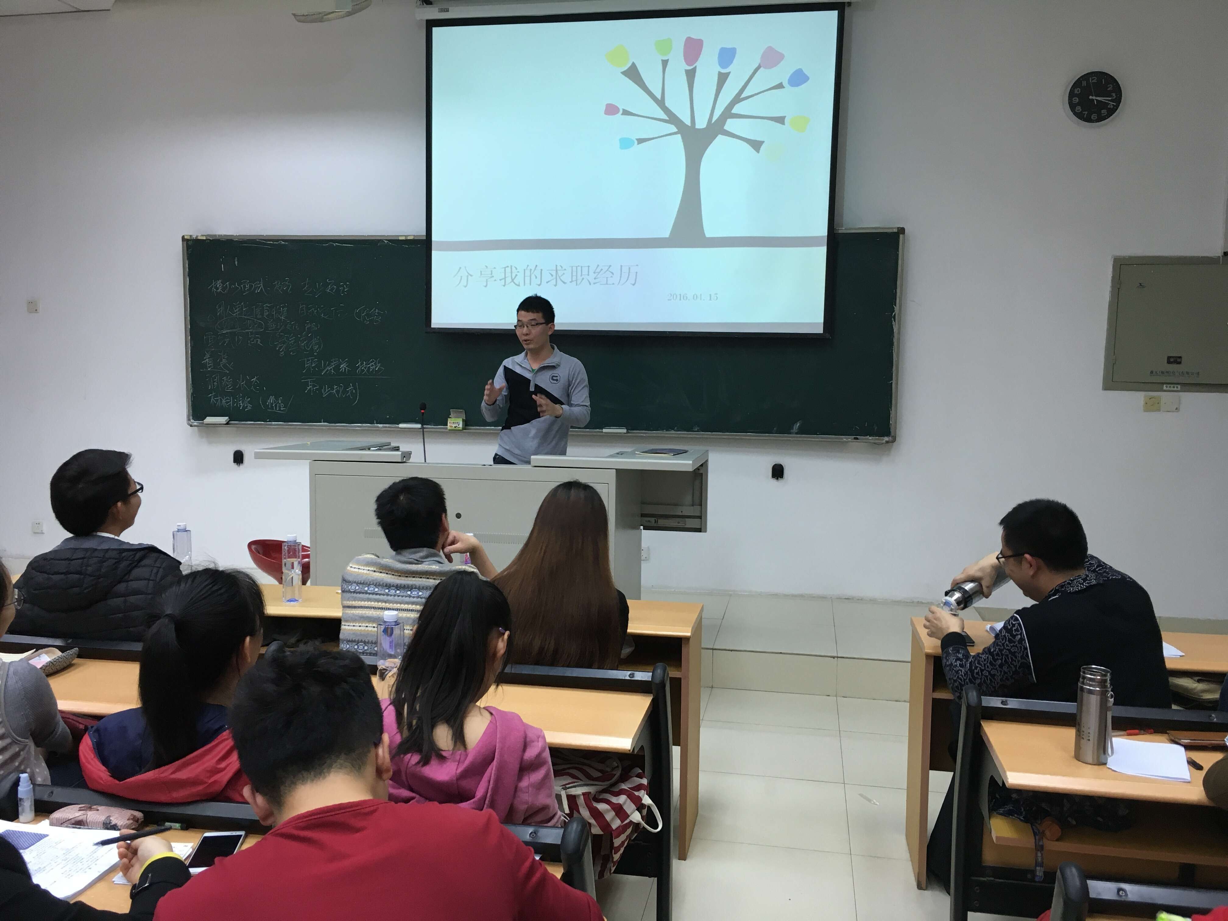 交流会由职业规划课陈艺全老师主持。他首先介绍了面试前要准备的事项,并结合职业规划课上的知识总结提炼求职知识。拿到厦门航空offer的林方泽首先上台分享了自己的求职历程。他针对无领导小组讨论结合自己的经验和总结进行详尽的讲解,并对面试过程中可能出现的各种状况给出了解决对策。紧接着应聘职能类岗位的张莉荃从“抓本质,搭框架,重表达”三个层次剖析了单面过程口头表达的方式方法。她通过自己的求职经历,强调暑期实习的重要性。