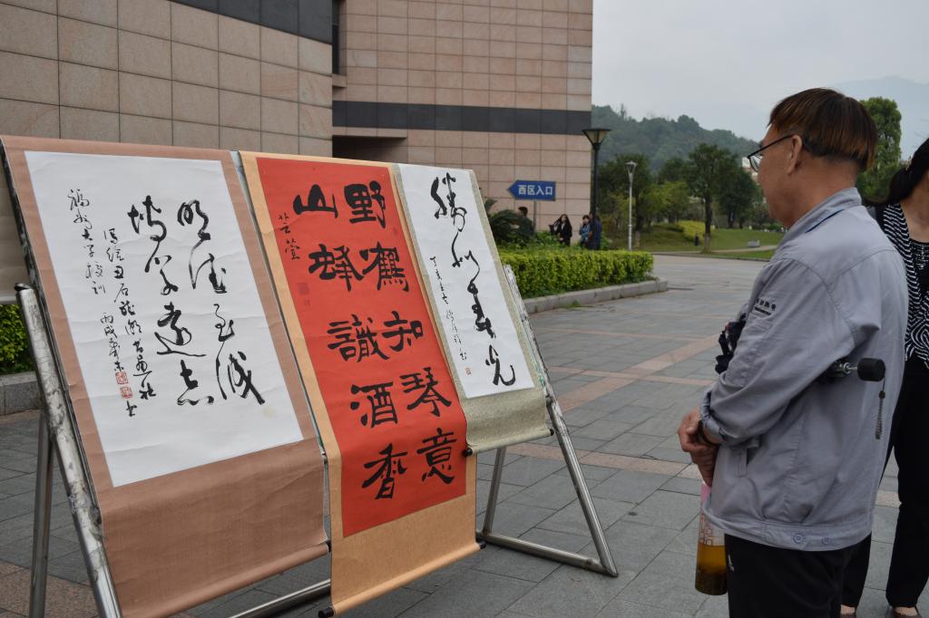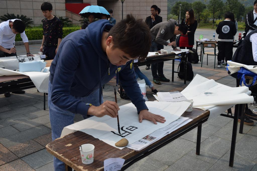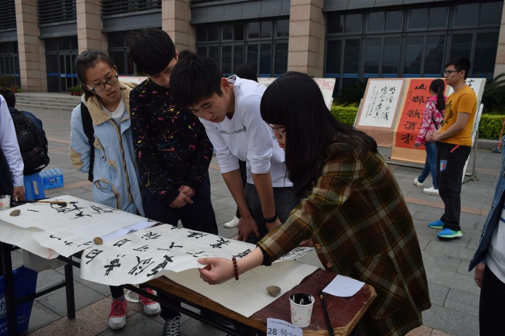 书法比赛于图书馆前的福万广场正式举行。本次比赛邀请了丑石听潮书画协会的负责人、石油 樱花动漫