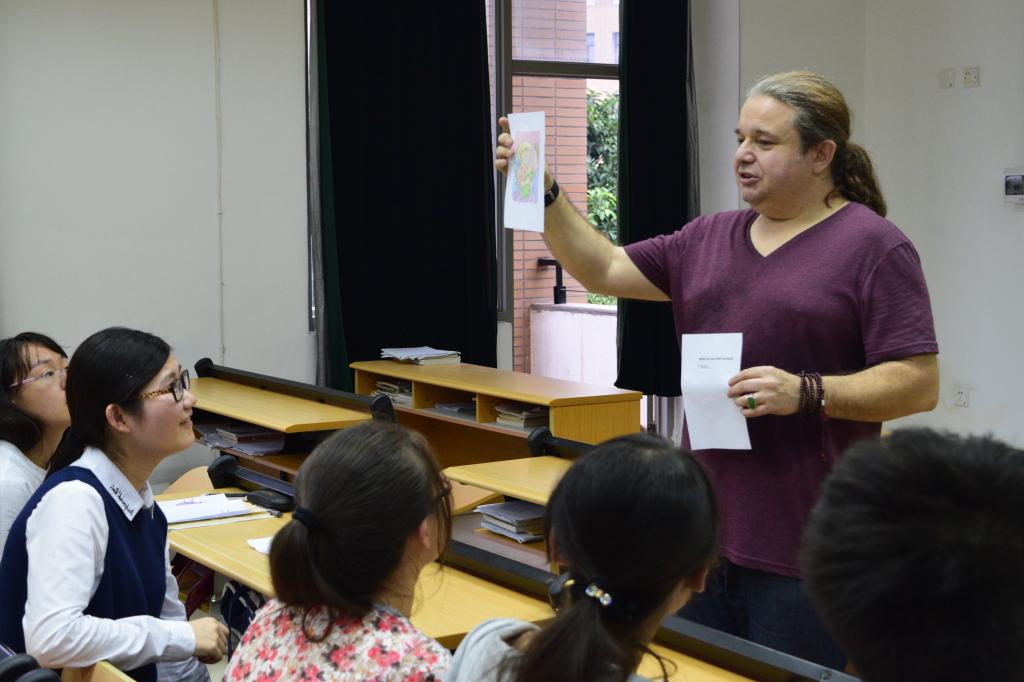每次的活动都会迎来新的伙伴,而Jordi老师照旧来一次风趣幽默的自我介绍。活动在Jordi的鼓励下热腾起来,随即进入了主题。首先,老师给每一位同学都发了一张图片,让同学们形容图片中人物的feeling,然后同学们到教室后面的纸条上找到与之相应的句子。现场气氛活跃,同学们积极参与其中。之后,jordi老师便发现有几个同学出现了错误,老师为他们讲解了这些单词的区别,建议同学们学会设身处地地思考问题。