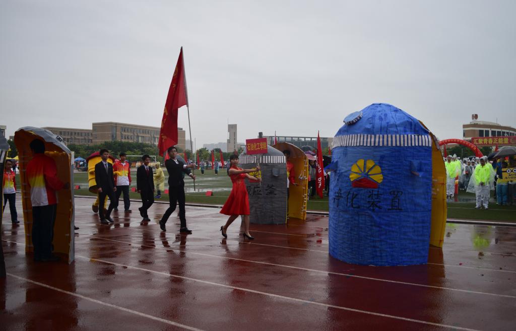 方阵队精神饱满、气宇轩昂。他们身着统一的红色服装,迈着有力的步伐,高喊“青春石化,展翅飞翔,奋勇拼搏,挑战自我,共筑梦想”的嘹亮口号,昂首阔步,意气风发的向观众走来。队伍前方是学院吉祥物小石小化,是以反应炉为原型创造的一对可爱的卡通形象。到了检阅地,方阵同学转换位置用手中的板拼出“化工废料,绿色产物”的字样,充分展现了石化人绿色环保的科学理念,成为开幕式方阵中的一大亮点。