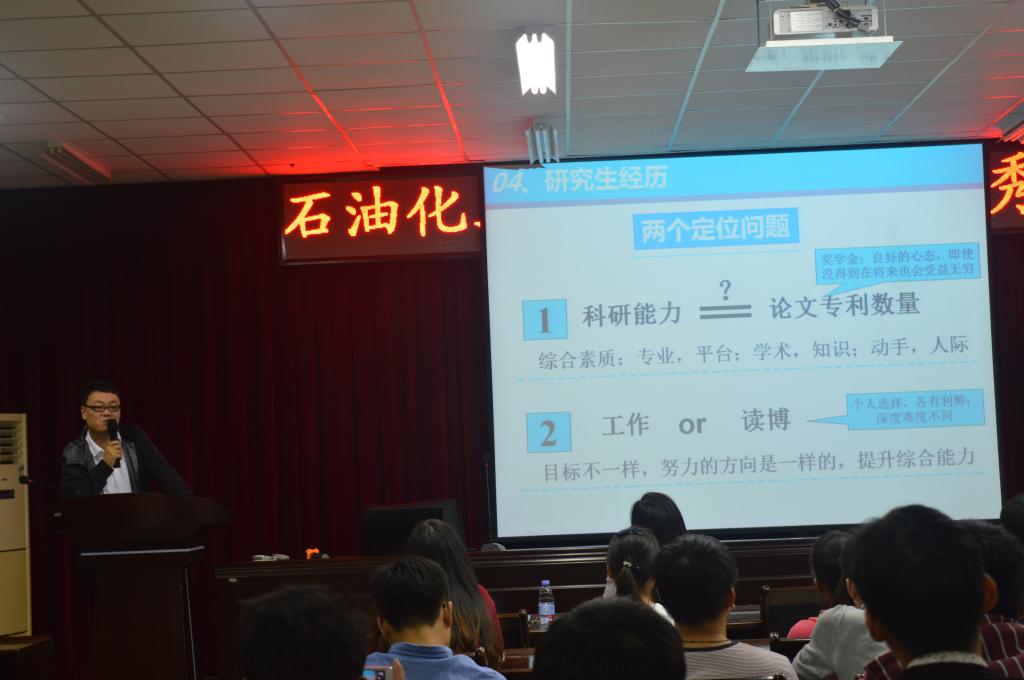在一个半小时的活动中,两位师兄师姐结合自身经验就研究生三年该怎样规划,怎样进行科学研究,以及工作就业、奖学金等方面进行了详细介绍,使同学们获益匪浅。