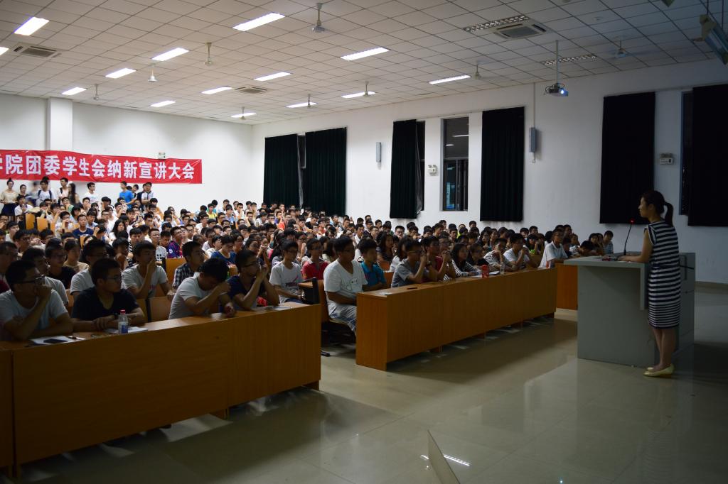 首先,蒋林娟老师为大会致辞,鼓励新生加入团委学生会。接下来,学生会主席蔡世逸与各位副主席依次向2015级新生做了自我介绍,展示了新一届团委学生会主席团的别样风采。随后,团委学生会各部门负责人向15级新生介绍院宣传部、文化部、记者团等十四个部门的具体情况,以详尽的介绍、精彩的PPT、震撼的视频,充分地将各个部门的基本工作职责、团队成员、工作内容、卓越成绩展示在大家面前。紧接着,团委学生会成员集体表示了对15级新生求贤若渴的心声,鼓励新生在课余时间积极参加各项活动,多多锻炼自己。