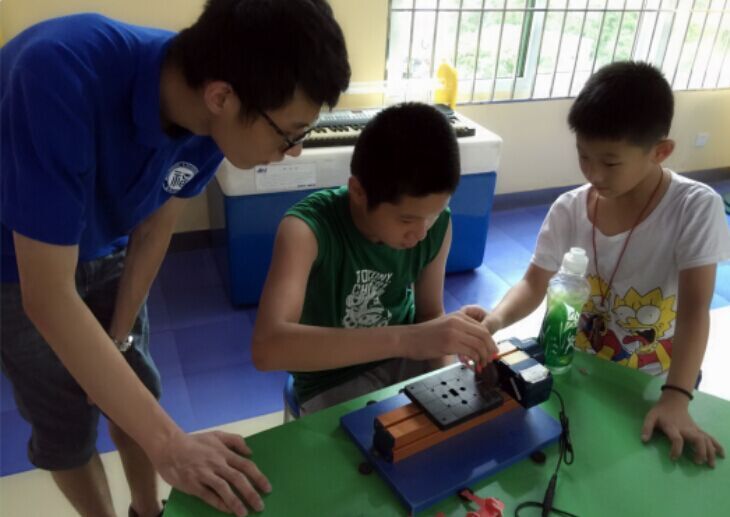 实践队员正指导孩子完成他们的零件制作