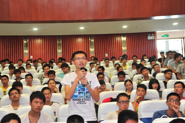黄金陵教授结合自己的学习、工作经历,从什么是“中国梦”、如何实现“中国梦”,“为什么成才”、“能不能成才”、“如何成才”五个方面为2013级新同学们带来一场内容翔实、意义深远的报告。对于“为什么成才”,黄教授指出,在这个国家欣欣向荣的时代,大家的梦想不能仅停留在个人的梦想上,要同“中国梦”联系起来,为实现“中国梦”而共同努力。对于“能不能成才”,黄金陵教授认为,立志是成才的基础,自信心的建立则是成才的必经之路。他以切身经历,鼓励同学们相信自己、努力奋进。随后,黄金陵教授就“如何成才”问题与新生进行了深入的探讨,他认为勤奋是成才的唯一途径,并对同学们提出几点建议:一是要有明确的学习目的性;二是要端正学习态度;三是要严格要求自己;四是要养成良好的学习习惯;五是要善于开动自己的头脑;六是要积极参加讨论课和听老师辅导答疑;七是要对阶段学习内容及时加以总结。最后,黄金陵教授向同学们介绍了历时14年的新型抗癌光敏剂“福大赛因”的研发过程及效果,并与在场学生积极互动,解答同学们对大学学习、校园生活等方面遇到的问题,报告会在一片片热烈的掌声中落下帷幕。