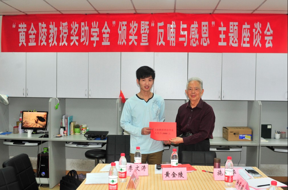 座谈会结束后进行了简单而又庄重的颁授仪式,十位受奖助的同学依次领奖并与黄金陵教授合影留念。