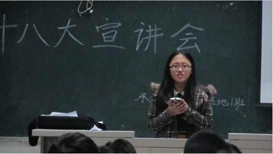 团委学生会主办,10级化学基地一班团支部承办的十八大精神报告会在实验南楼301隆重召开。本次邀请到的主讲嘉宾是法学院学生会副主席张珺,出席本次报告会的有10级班委及入党积极分子。现场座无虚席,气氛活跃。