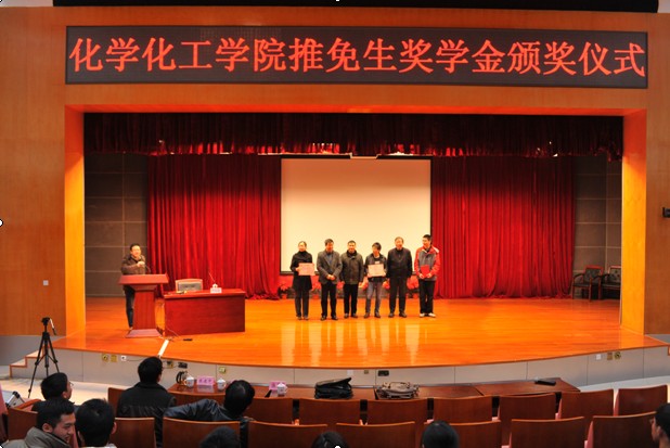 第一届“推免生奖学金”颁奖大会在图书馆明德厅隆重举行。参加本次“推免生奖学金”颁奖仪式的有:学院常务副院长陈建中教授、党委副书记施卫华、副院长黄剑东研究员和研究生论坛主讲教授福建石化集团公司蔡永亮副总工程师。