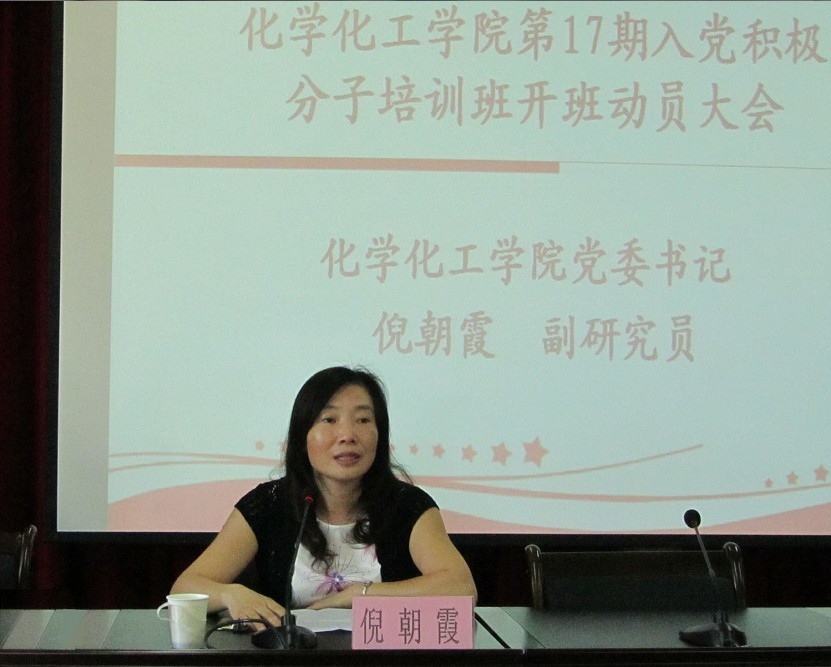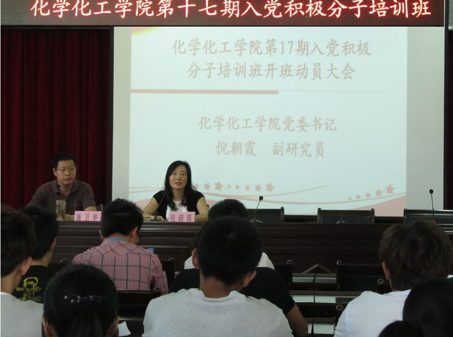 第17期学院分党校于嘉锡楼413开班。出席本次分党校开班仪式的有学院党委书记倪朝霞老师、院党委副书记施卫华老师、10级辅导员朱振宁老师以及11级辅导员华琴老师。首先,党委书记倪朝霞老师致开幕词,她对前来参加培训的积极分子表示热烈欢迎,向学生们阐明了学院分党校培训的目的与意义,并对新学员们提出了三点希望与要求:第一,把握机遇,勤奋学习;第二,突出重点,讲究方法;第三,坚持宗旨,创先争优。希望新学员们能珍惜这每一次的学习机会,并在今后的学习中不断提高自己,争取早日成为一名合格的共产党员。最后倪书记预祝此次培训会取得圆满的成功。