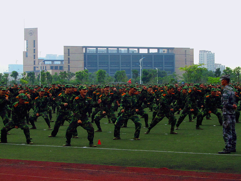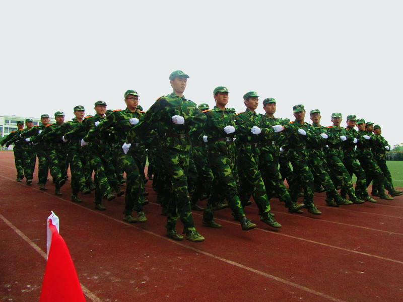 昂扬向上的开营仪式之后,新生们便在教官的号令下进行着一项又一项的训练。站军姿,唱军歌,踢正步……军官认真地教,新生们卖力地学。站立时同学们更是像丰碑一样笔挺地伫立着。齐步走时,口号嘹亮,步伐整齐,气势惊人。他们用坚毅的眼神和挺拔的英姿告诉了老师、教官、家长:我能行!军歌嘹亮,热情万丈,“团结就是力量,团结就是力量,这力量是铁,这力量是钢……”, 洪亮的声音响彻整个校园,让人倍感振奋!连与连之间的拉歌更是乐趣无穷,谁都不甘落后。福州的天气虽未娇艳似火,却也阴雨绵绵,叫人苦不堪言。即使白天有艰苦训练,晚上有新生开学教育,但他们仍相信,坚持就是胜利!