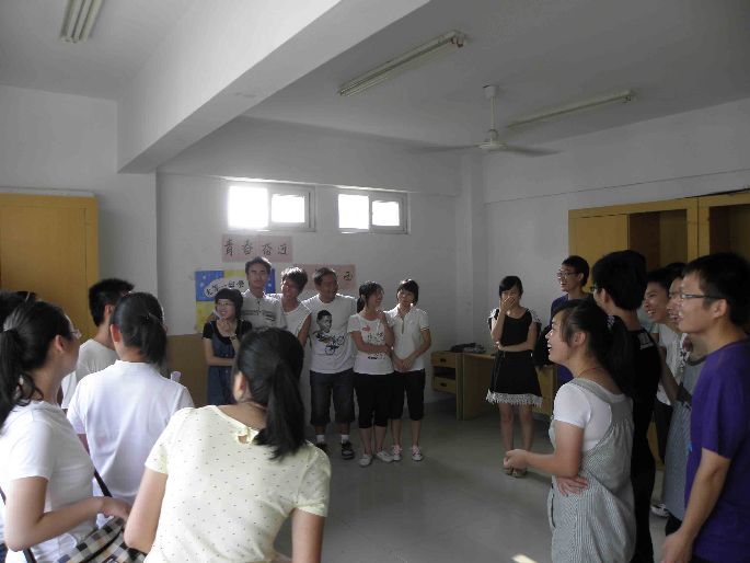 早上八点左右28号楼三楼活动室内11级化学三班“破冰 ”活动从“凑钱”游戏开始,男生为“一元”,女生为“五角”。大家兴高采烈为“凑钱”而不亦乐乎。接下来是“大风吹”的游戏,临时组织者在中间点到具有某一特征的同学,被点到的学生就要快速的互换位置,动作慢的学生就要替换临时组织者来组织下一轮的游戏并表演小节目。每次表演的结束都伴着大家“爱的掌声”。由此,表演节目的学生得到了大家的肯定,增强了信心,班主任黄伟元更是以搞逗的言行举止将“破冰”带向高潮。