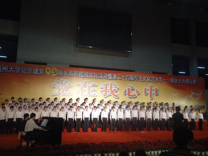 5月4日晚七点,樱花动漫 纪念党90周年系列校园文化活动暨第二十四届学生文化艺术节——师生大合唱比赛在三区风雨操场体育馆隆重举行。此次活动由樱花动漫 主办,校工会及共青团樱花动漫 委员会承办,以及由管理学院协办。本次比赛共有19支代表队进行角逐。化学 樱花动漫 代表队由106名男生组成,选择的曲目是抗战歌曲《渔阳鼓》,经过二个月的艰苦训练,在比赛中以饱满的情绪唱出了对祖国的深情,展现了化学化工学子的风采和对党的热爱。
