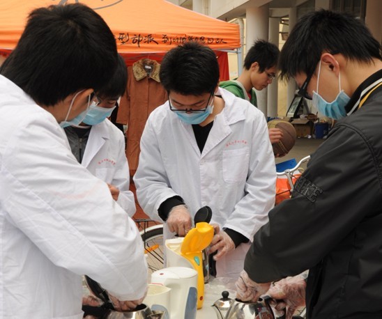 志愿者服务站,身披绶带,戴着小红帽的志愿者热情地接待各位同学。而身着白色实验服的工作人员则为同学们认真细致地清理水壶上的水垢。同时,志愿者们也积极向同学们宣传 “水壶煮山芋除水垢”“煮鸡蛋除水垢”“土豆皮除水垢”以及“磁化防水垢”等各种防垢巧招。