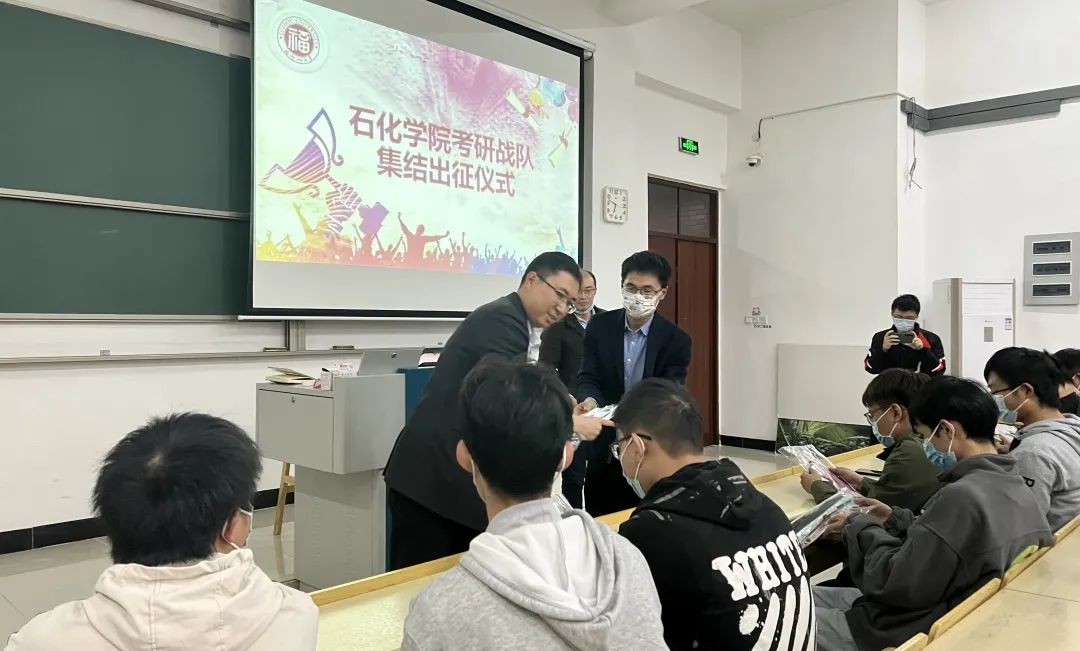 于泉港校区教学楼205举行石化学院考研战队出征仪式,林航老师为考研学子讲述考风考纪,进行考前指导慰问,发放文具袋以及餐券,向最后冲刺的同学表达关怀和加油鼓劲。