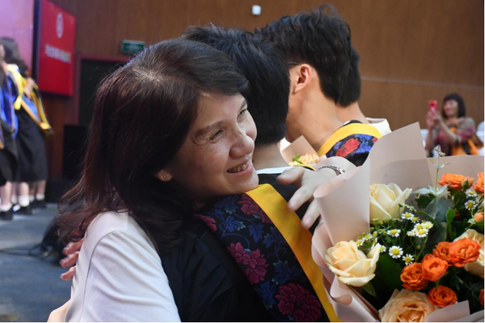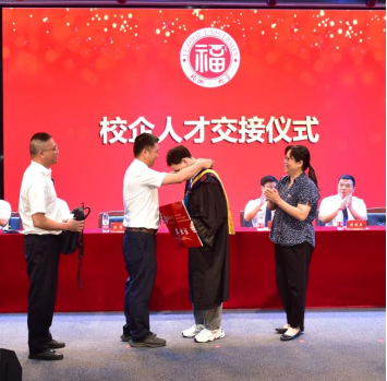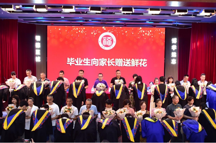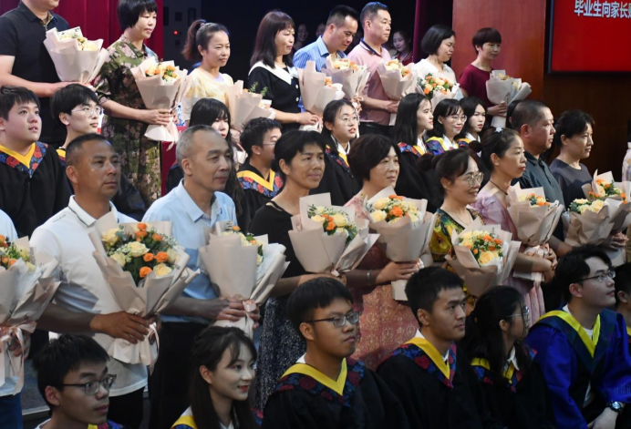 随后,毕业生代表向家长代表赠送鲜花。“春晖寸草,山高海深。”世界上最大的恩情莫过于父母的养育之恩,来到现场的家长代表们受邀上台接受毕业生代表们献花,拥抱并合影留恋。