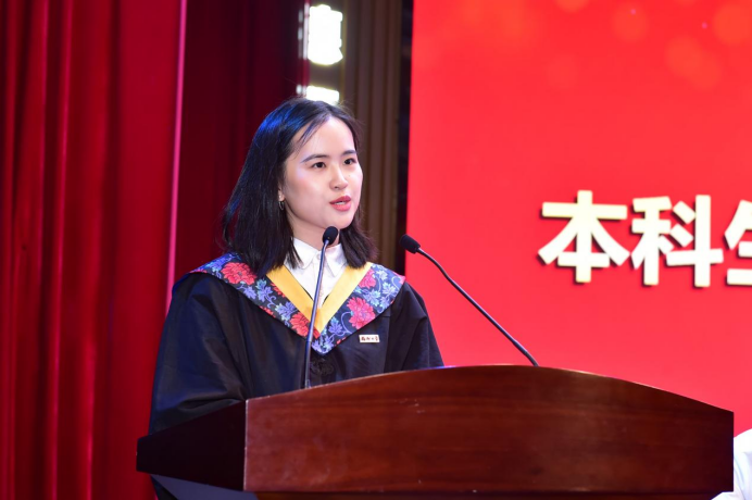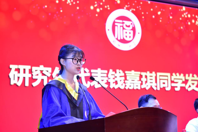 研究生代表钱嘉琪和本科生代表颜佳燕两位同学作为毕业生代表上台讲话,她们代表全体毕业生向一直以来关心学生成长的领导和辛苦教导学生的老师,表示最衷心的感谢和最崇高的敬意!