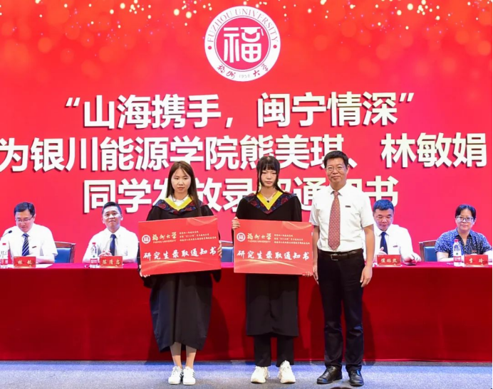 党委施卫华书记为考研升学代表、银川能源学院交换生熊美琪、林敏娟两位同学发放录取通知书。山海携手,闽宁情深,学院积极响应习总书记关于闽宁共建、山海协作的号召,每年对口培养银川能源学院30名交换生。今年,银川能源学院熊美琪、林敏娟同学成功考上本校研究生,书写了学院闽宁合作的新篇章!