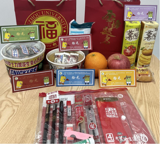 福袋中的礼品寓意深刻,意义非凡。其中,有“逢考必过”的文具套装,有寓意着“脐”开得胜、心想事“橙”的脐橙,全“力”以赴的士力架,“苹”稳上岸的苹果、“巧克”难题的巧克力、“包”你全会的小面包,如你所“愿”的薯愿,有为健康保驾护航的口罩,更有特别定制版化工暖心考研餐券。满载着全院师生对考研学子最真挚的祝福,助力考研学子把握好最后的冲刺阶段,全力以赴、金榜题名。