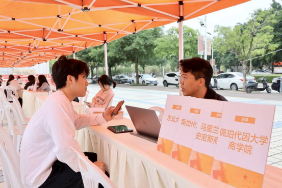 本次“留学嘉年华”活动分别以美国、英国、加拿大、澳洲新西兰、日韩、德意法爱、中国香港、中国澳门等咨询区外个性化的设计了国境外访学项目咨询、考研留学双规划指导、无需雅思入读咨询区、海外深造简历咨询区、海外直博区等14个板块,来自多所世界名校的招生顾问与同学们面对面沟通留学申请和录取细节,进行1v1评估指导,全方位多元化为学生提供了与世界名校“零距离”“面对面”的沟通机会,更好地帮助同学们跳出舒适圈去感知世界,对未来学业生涯进行更详细的思考和规划。