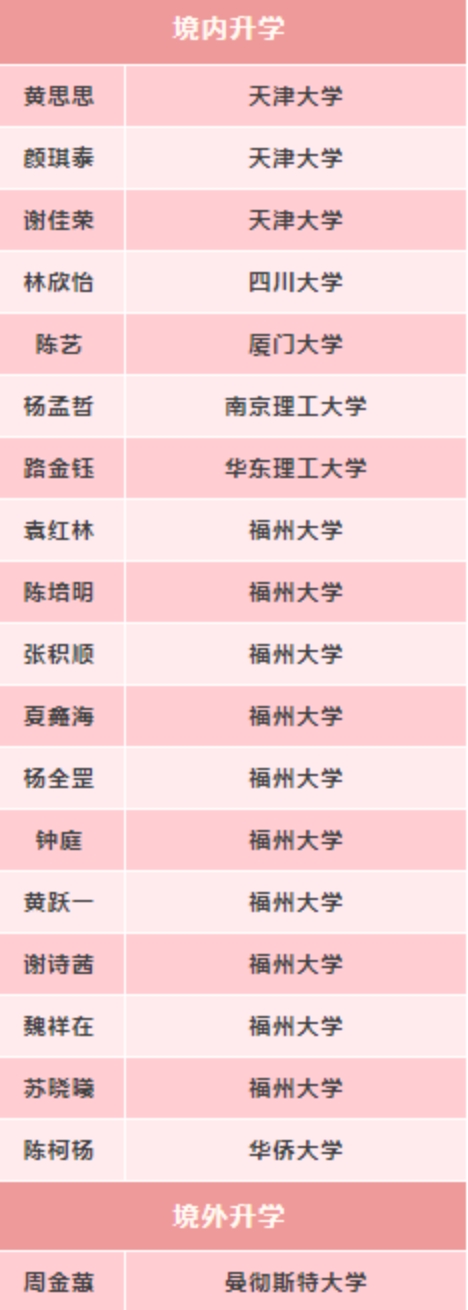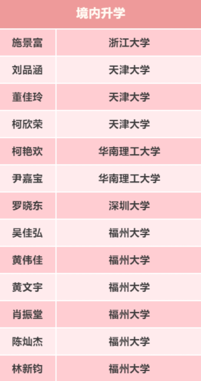 在面对繁重的课程和学业压力,同学们在完成个人任务之余,自发组建学习小组,分享学习资料,交流学习方法,打破信息差,他们每天交流学习进度,分享学习心得,相互帮助、鼓励,班级成功推免的同学主动做好考研同学的后勤工作,升学率达67.9%。班级同学即将赴曼彻斯特大学、浙江大学、天津大学、华南理工大学等知名院校攻读研究生。